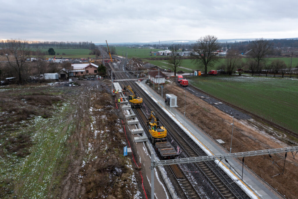Dále probíhal návoz materiálu – silniční panely, železobetonové pražce, kolejnice.