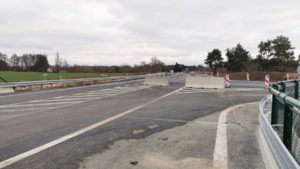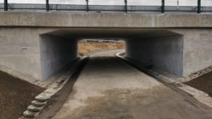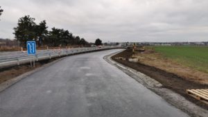 Konec obchvatu, podjezd pro cyklisty. za betonovými svodidly je patrná část stavby, které je již nyní v předčasném užívání a je po ní vedena doprava.