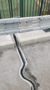 Detail mostního závěru na mostě před železniční trať. Tato část mostu řeší různý (zejména teplotou vyvolaný) posun mostní konstrukce oproti pevným opěrám.