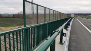 Detail zábradelního svodidla na mostě přes železniční trať, zábradlí a proti dotykové ochrany. Před mosty jsou osazeny modré směrové sloupky, které řidičům signalizují možnou změnu stavu povrchu vozovky v zimě (náledí vzniklé na mostě vlivem promrznutí tenké konstrukce mostu).