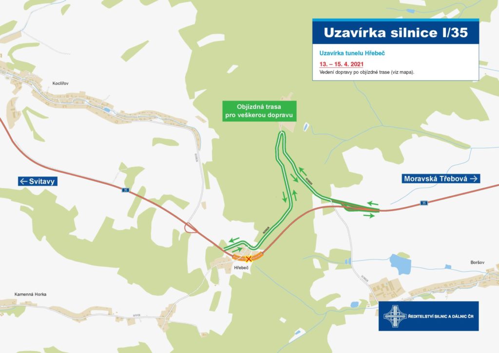 Z důvodu plánované údržby bude od úterý 13. 4. do čtvrtku 15. 4. kompletně uzavřen tunel Hřebeč na silnici I/35, hlavním tahu ze Svitav na Moravskou Třebovou. Pro veškerou dopravu je navržena oboustranná objízdná trasa po sil. III/36826, přes obec Hřebeč.