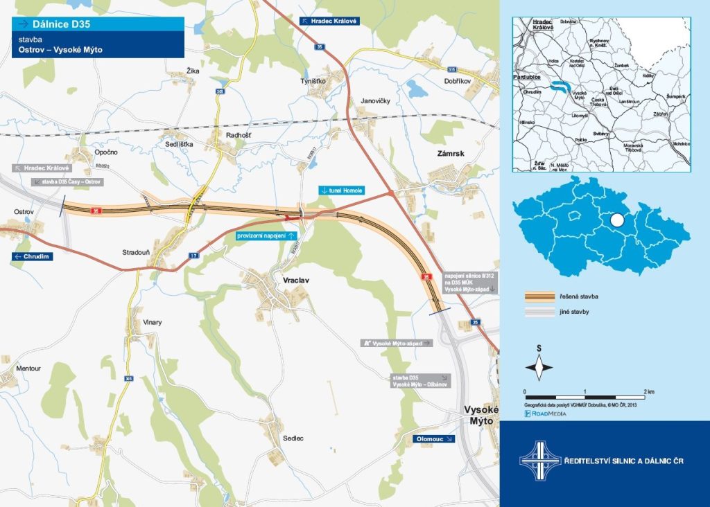 Na 7 km úseku dálnice D35 „Ostrov – Vysoké Mýto“ probíhá v současné době majetkoprávní příprava a průzkumné práce. Máme hotovou dokumentaci pro stavební povolení a probíhá inženýrská činnost pro získání stavebního povolení. Součástí stavby je tunel Homole, jenž je nejsložitějším objektem stavby a z tohoto důvodu bude realizován samostatně. Nyní máme zahájeny práce na zadávací dokumentaci stavby a probíhá příprava projektu pro záchranný archeologický průzkum.