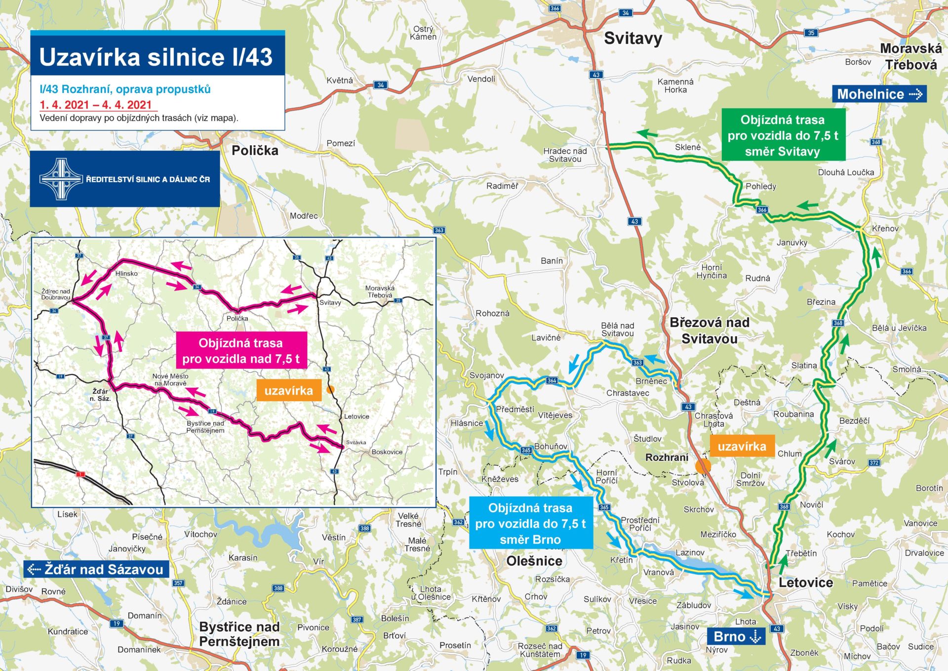 Tento týden zahájíme na silnici I/43 opravu propustků v obci Brněnec (část Chrastová Lhota) a Rozhraní na Svitavsku. V termínu od čtvrtku 1. 4. do neděle 4. 4. bude silnice I/43 v obci Rozhraní úplně uzavřena. Objízdné trasy jsou navrženy zvlášť pro vozidla nad 7,5 t a pro osobní vozidla do 7,5 t následovně: