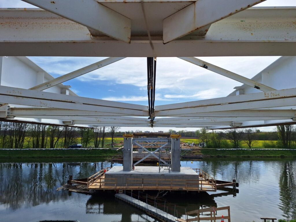 Dnes dopoledne proběhl v rámci stavby I/36 Pardubice, Trnová-Fáblovka-Dubina výsuv čtvrtého taktu nosné konstrukce lanového mostu přes Labe. Most se opřel o první pylon a je tak ve své polovině.
