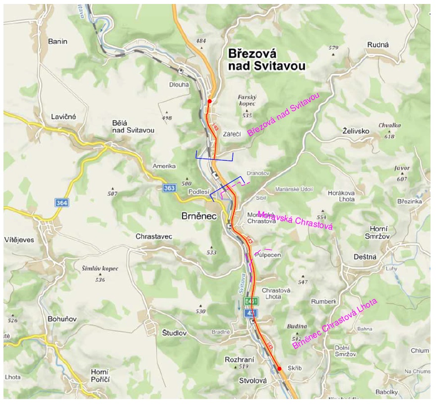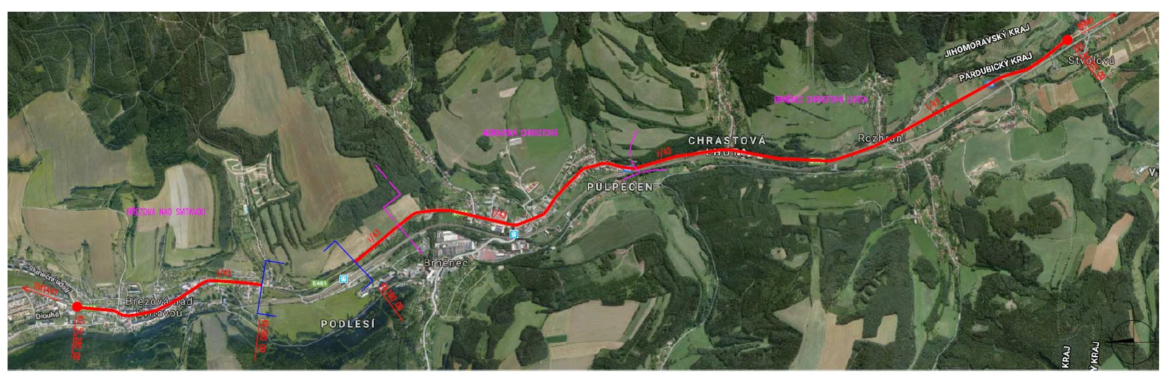 - etapa B: od 19. 4. 2021 do 16. 5. 2021: km stavby 3,020 – 3,520, v úseku od nemovitosti čp. 26 Brněnec, místní část Moravská Chrastová po nemovitost čp. 120, Brněnec, místní část Moravská Chrastová.