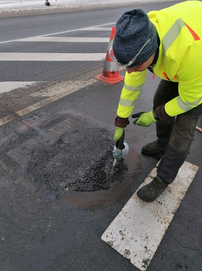 Silný mráz z předchozích dnů se na našich silnicích podepisuje častějším výskytem výtluků, které se tvoří především na nejvíce vytížených a chemicky ošetřovaných komunikacích. V současnosti tyto poruchy řešíme nejčastěji pomocí studené balené asfaltové směsi. Tyto drobné výspravy je možné provádět velmi operativně, kdy vozovky průběžně opravuje reparační tým v rámci inspekčních jízd. K dispozici však máme také technologie, umožňující poškozená místa opravit trvaleji. Využíváme jak ohřívanou balenou směs SILKOT, tak mikrovlnnou technologii FUTTEC. Tyto technologie kombinujeme v závislosti na počasí i míře poškození vozovky.