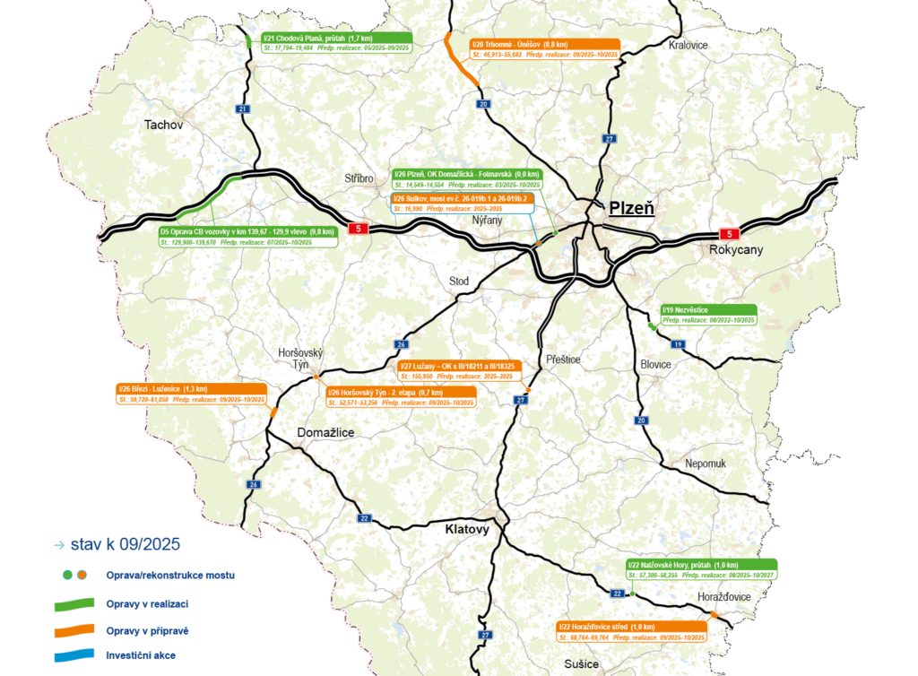 Ještě během září budou zahájeny minimálně čtyři z šesti dalších plánovaných akcí, a těmi budou opravy na I/26 u Březí a v Horšovském Týně, I/22 v Horažďovicích a na I/20 u Trhomného.