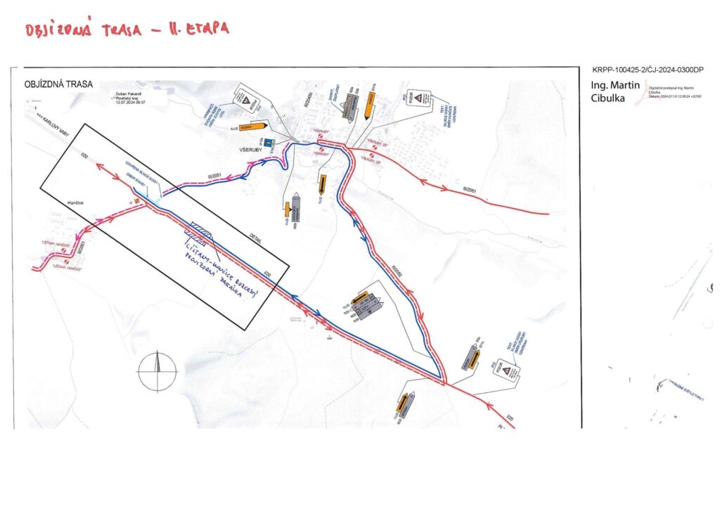 Během přestavby křižovatky bude silnice I/20 s omezeními i nadále průjezdná a provoz zde bude veden kyvadlově. Výraznější omezení se budou týkat silnice III/2051, která bude zcela uzavřena, a to v rámci dvou etap. Během první etapy bude silnice uzavřena v obou směrech, tedy ve směru od Všerub i Hunčic. Během druhé etapy už bude silnice uzavřena pouze ve směru od Všerub.