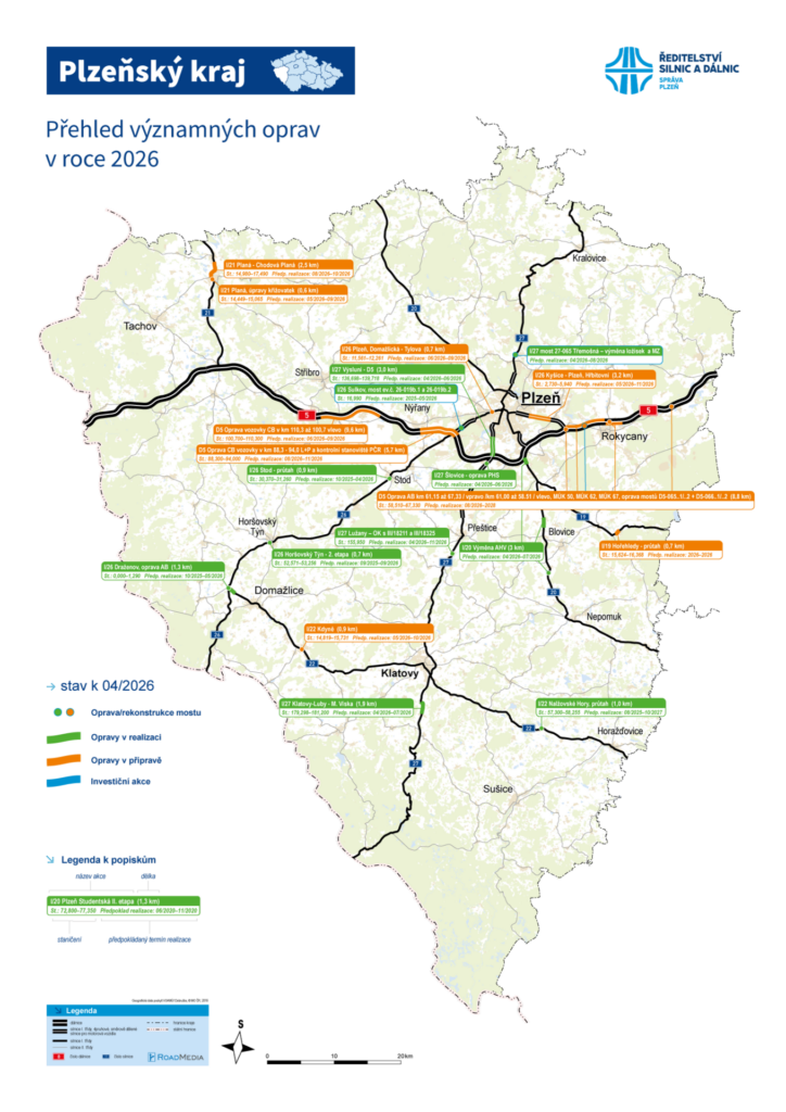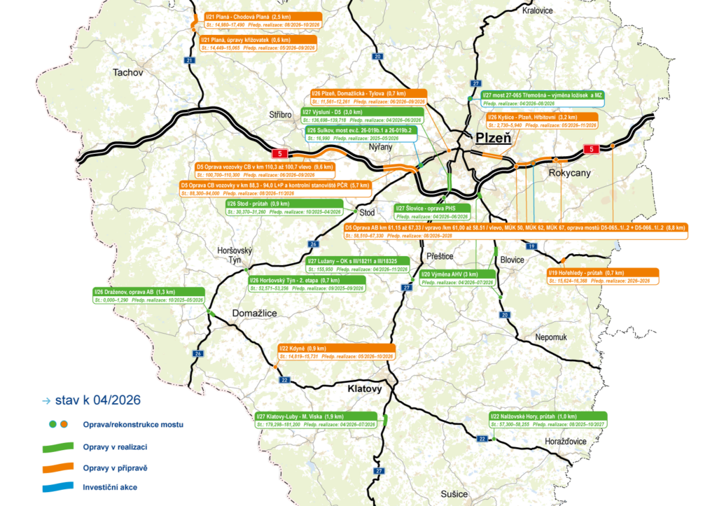 Aktualizovaná mapa oprav plánovaných na letošní rok v Plzeňském kraji.