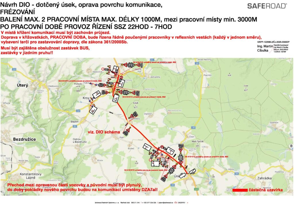 Stav povrchu je zde již konstrukčně nevyhovující. Vlivem intenzivního dopravního zatížení vykazuje místy jen krátkou zbytkovou životnost. Obrusná vrstva je opotřebená, s trhlinami zasahujícími až do podkladních vrstev. V následujících necelých dvou měsících proto dojde k výměně asfaltových vrstev, včetně lokálních oprav podkladu. Součástí stavby bude také výměna a doplnění svodidel, odfrézování krajnic, pročištění příkopů a nezbytné úpravy sjezdů a propustků.
