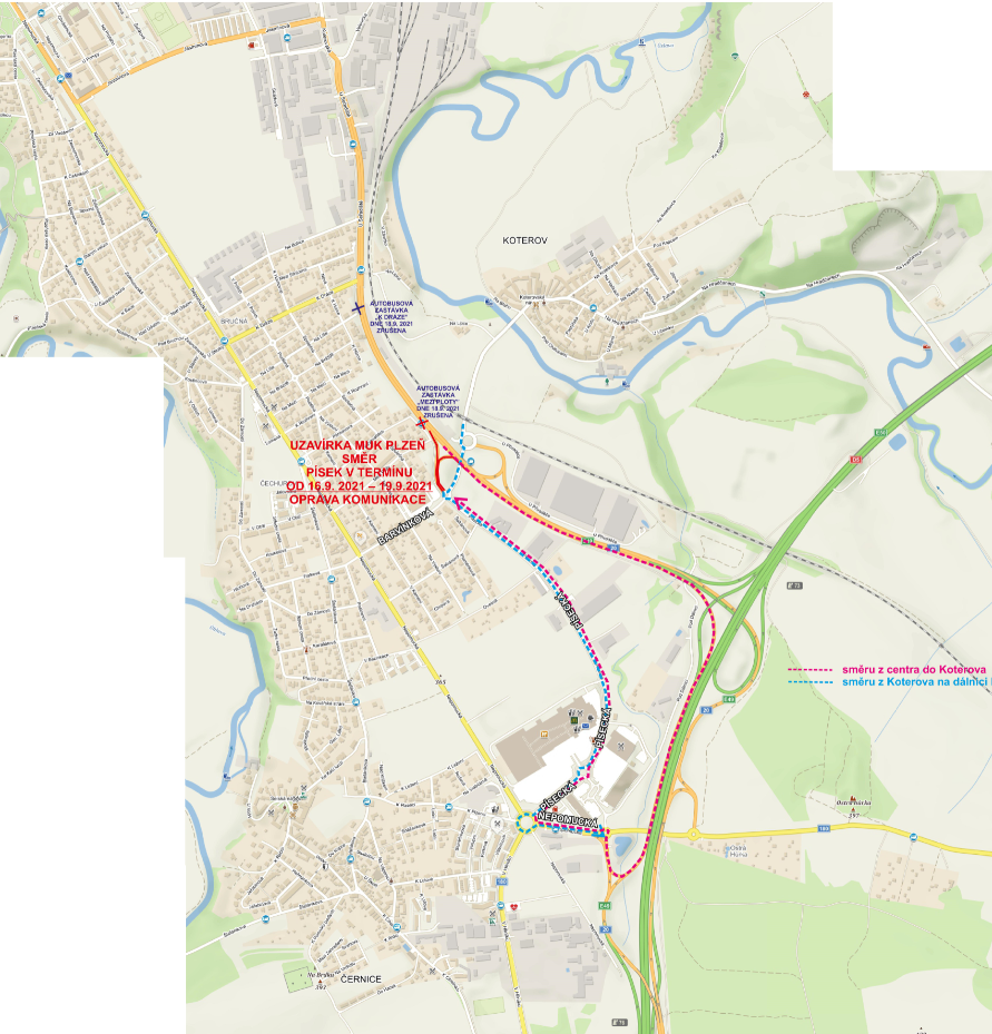– ve směru z dálnice D5 příp. silnice I/20 do Koterova – silnice I/20, ul. Nepomucká, ul. Písecká, silnice III/180 20 (příp. silnice II/180 při jízdě ve směru z Písku)