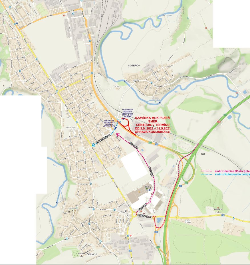 V termínu od 9. 9. 2021 do 12. 9. 2021 dojde k uzavření mimoúrovňové křižovatky ve směru Plzeň centrum Koterov.