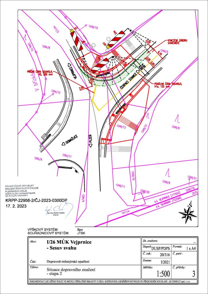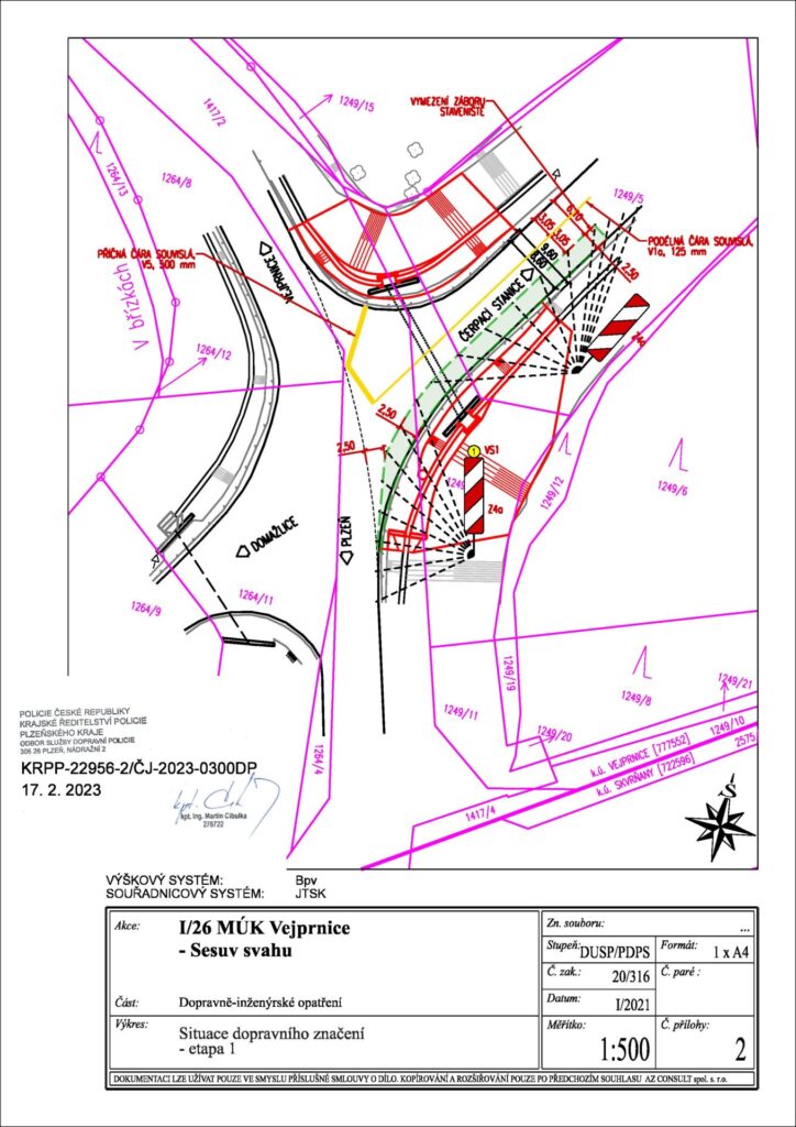 Pro Ředitelství silnic a dálnic provede stavební práce společnost ROADFIN STAVBY s.r.o. za cenu 1,6 mil. Kč bez DPH. Omezení provozu kvůli provádění stavebních úprav je následně povolené od 3.3.2023 do 7.5.2023.