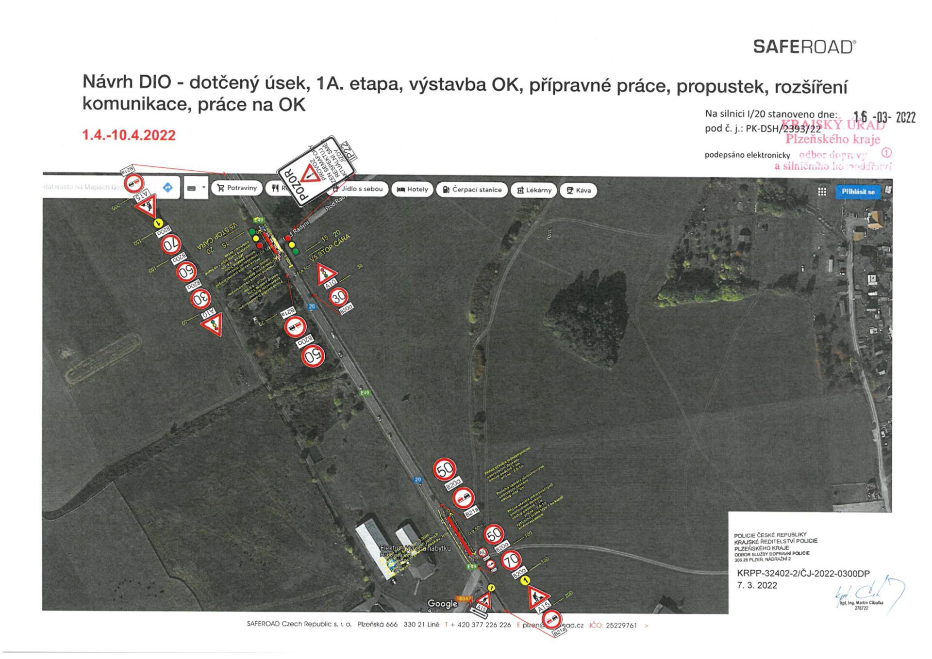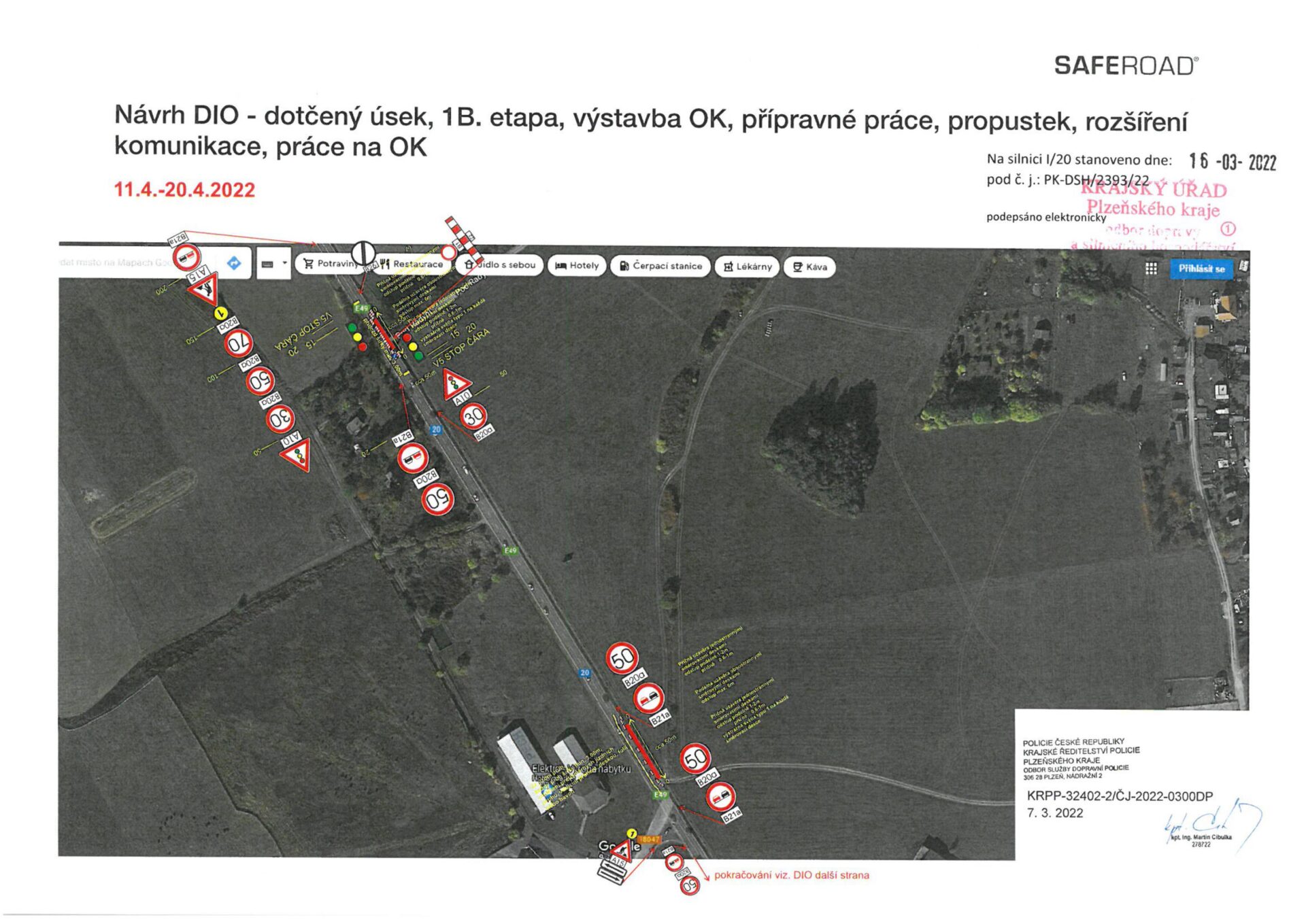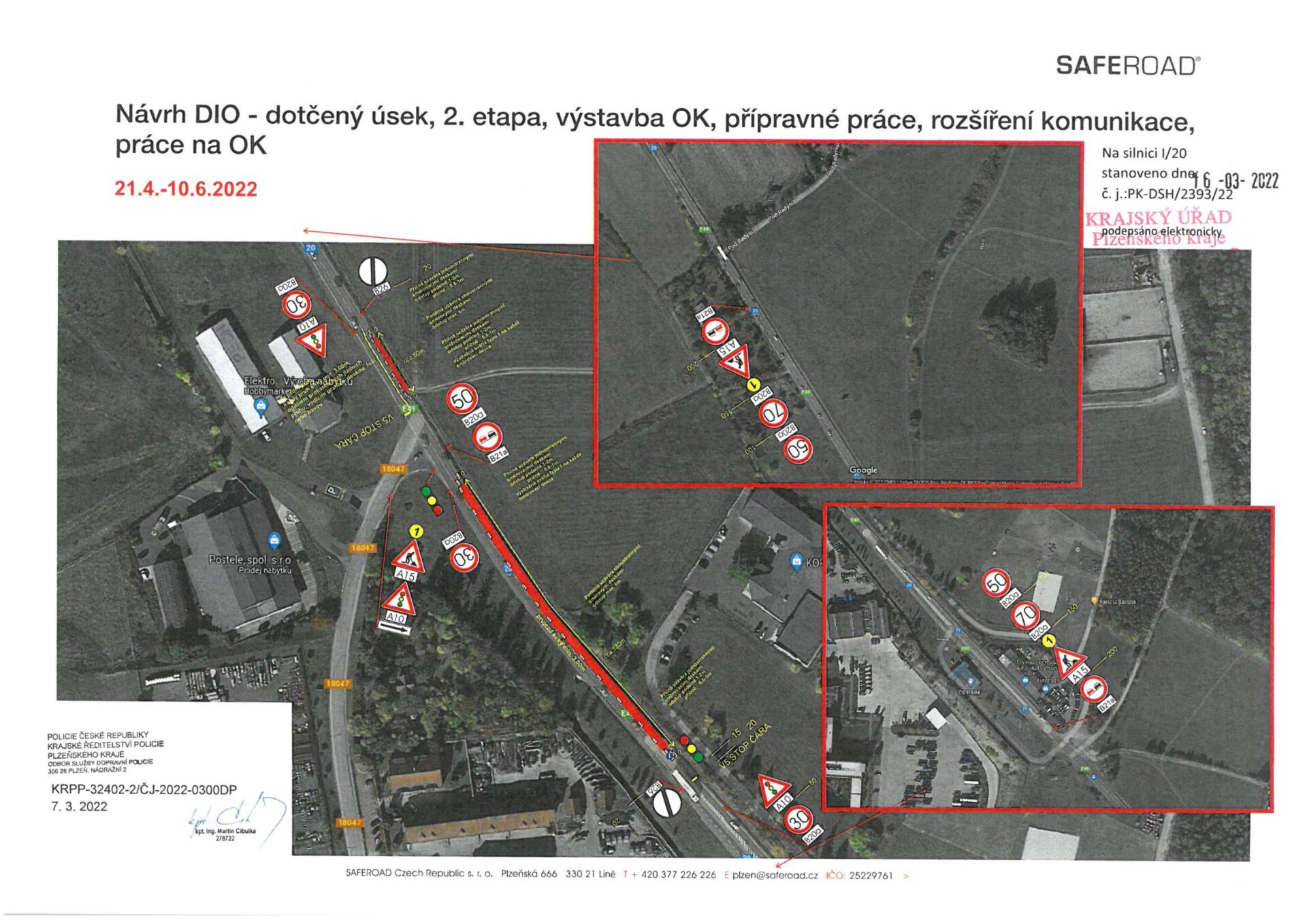 Vzhledem ke stavebním úpravám vozovky bude od začátku dubna až do konce června nutné částečně omezit provoz na komunikaci I/20 v místě křižovatky I/20 a III/18047. Vozidla budou po dobu částečné uzavírky jezdit jedním jízdním pruhem kyvadlově. Vzhledem k tomu, že prstenec nové křižovatky zasahuje do stávající silnice bude i v následujících v etapách stavby nutné provoz na silnici I/20 poté i nadále omezovat.