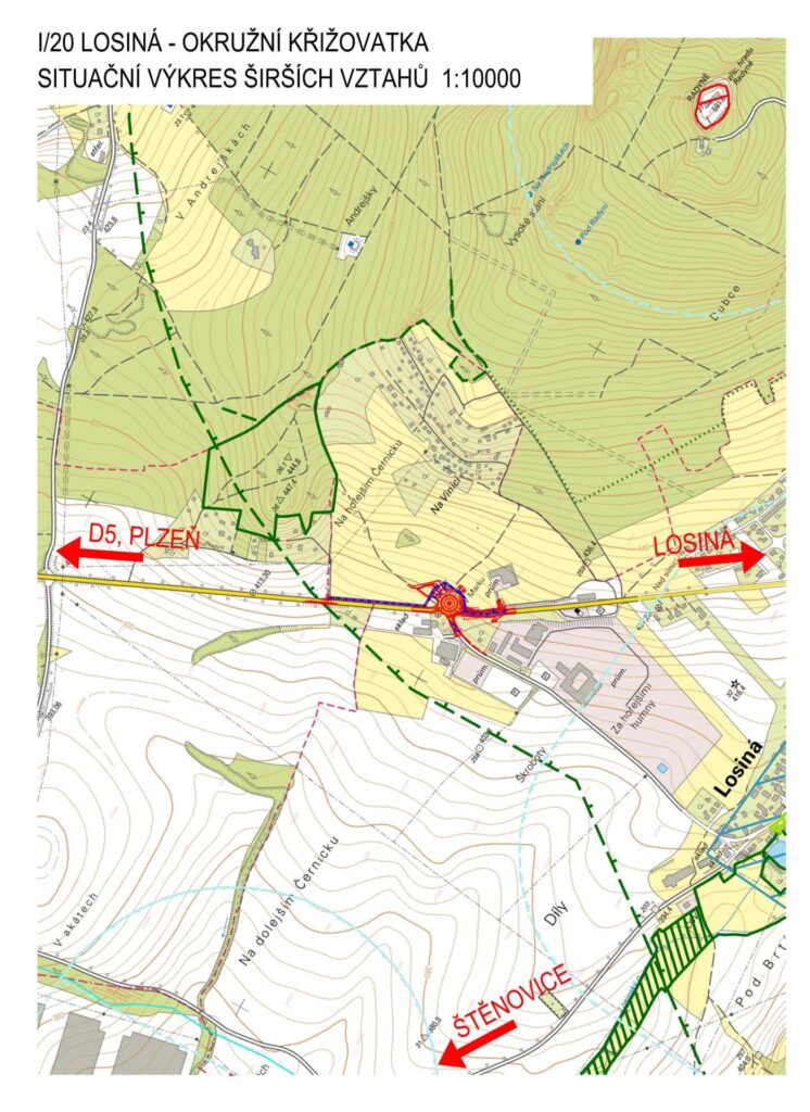 Výsledná podoba okružní křižovatky počítá se založením budoucích větví mimoúrovňové křižovatky Losiná, která bude součástí plánovaného obchvatu obce.