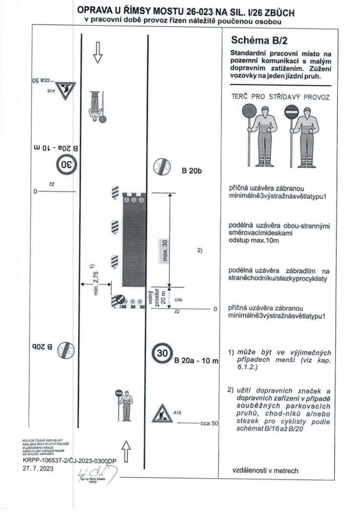 Práce na opravě mostu ve Zbůchu u Plzně v následujících dvou týdnech (14.8. – 25.8.) omezí provoz na silnici I/26. V pracovní době bude provoz na místě veden jedním jízdním pruhem kyvadlově. Mimo pracovní dobu projedou řidiči řešeným úsekem dvěma zúženými jízdními pruhy.
