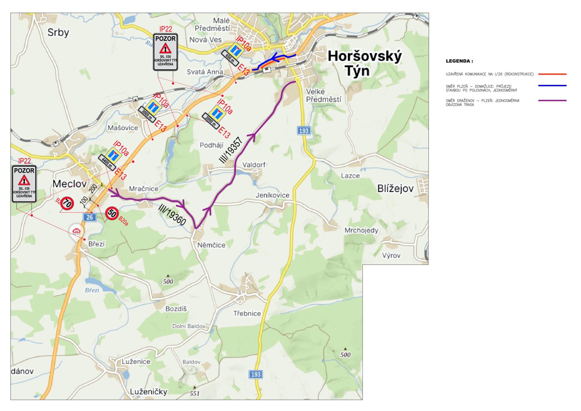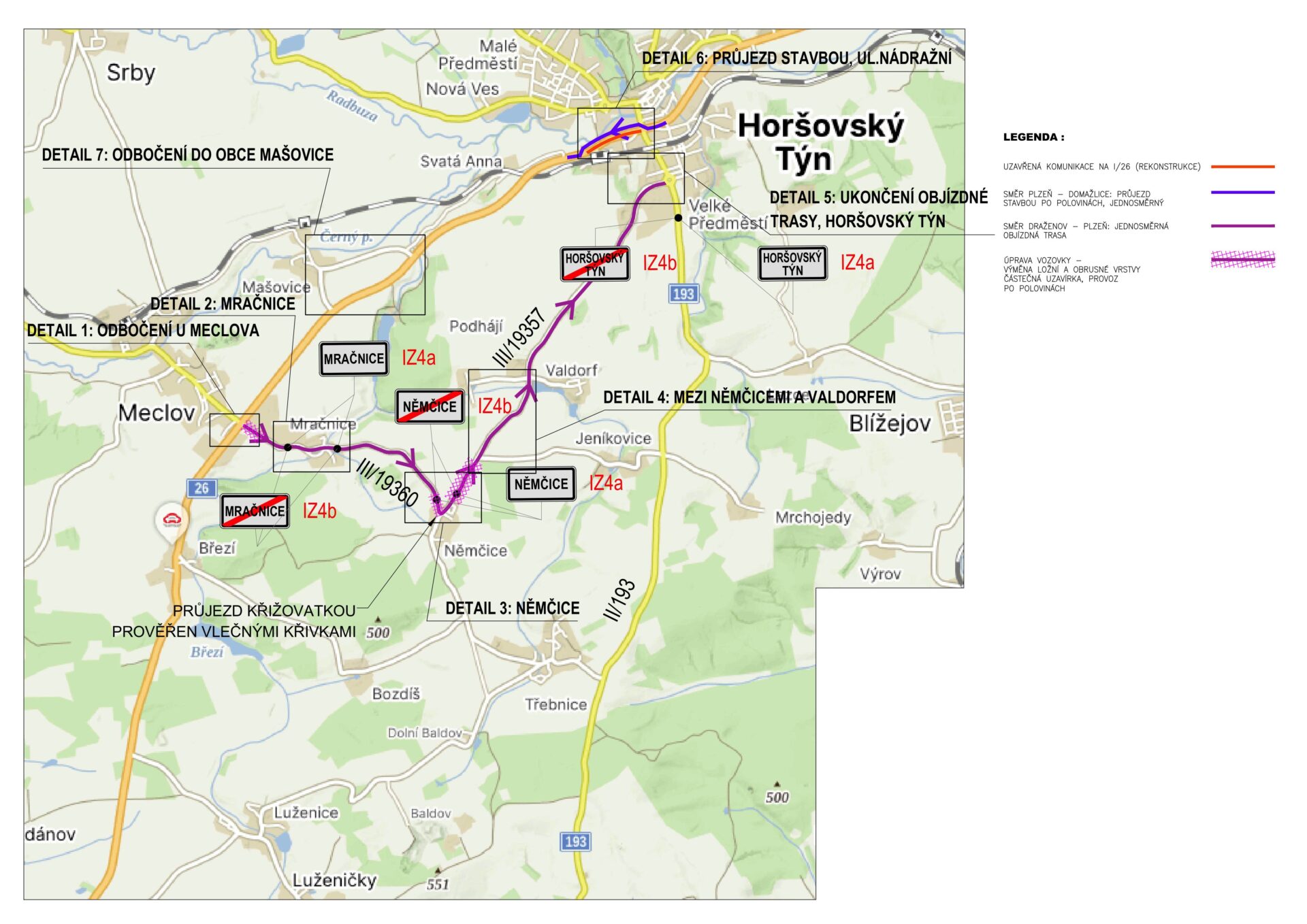 Provoz ve směru Draženov – Plzeň bude ve všech etapách veden po jednosměrné objízdné trase po silnici III. třídy (odbočením ze silnice I/26 u obce Meclov na silnici III/193 60, dále za křižovatkou silnic III/193 60 x III/193 57 v obci Němčice po silnici III/193 57 obcí Valdorf k okružní křižovatce v obci Horšovský Týn).