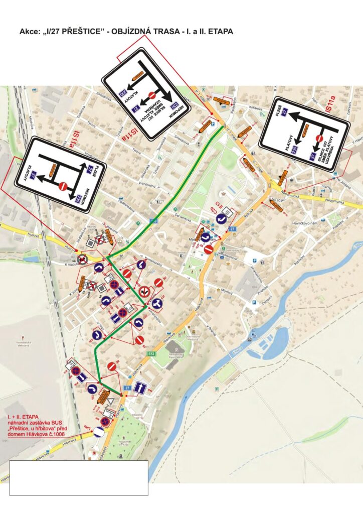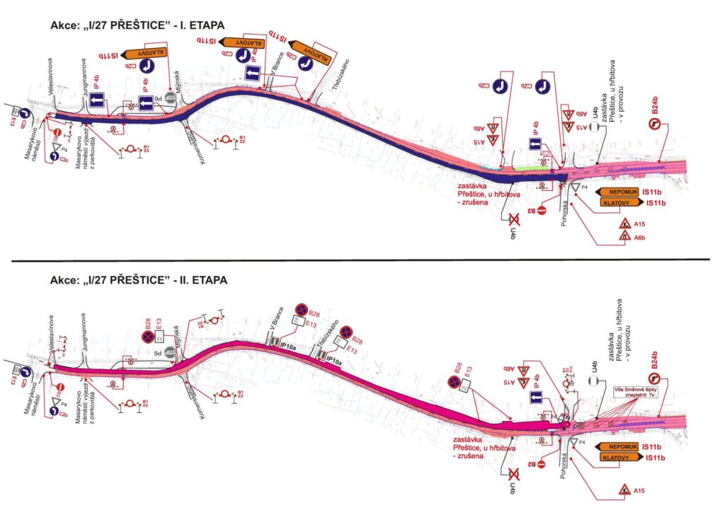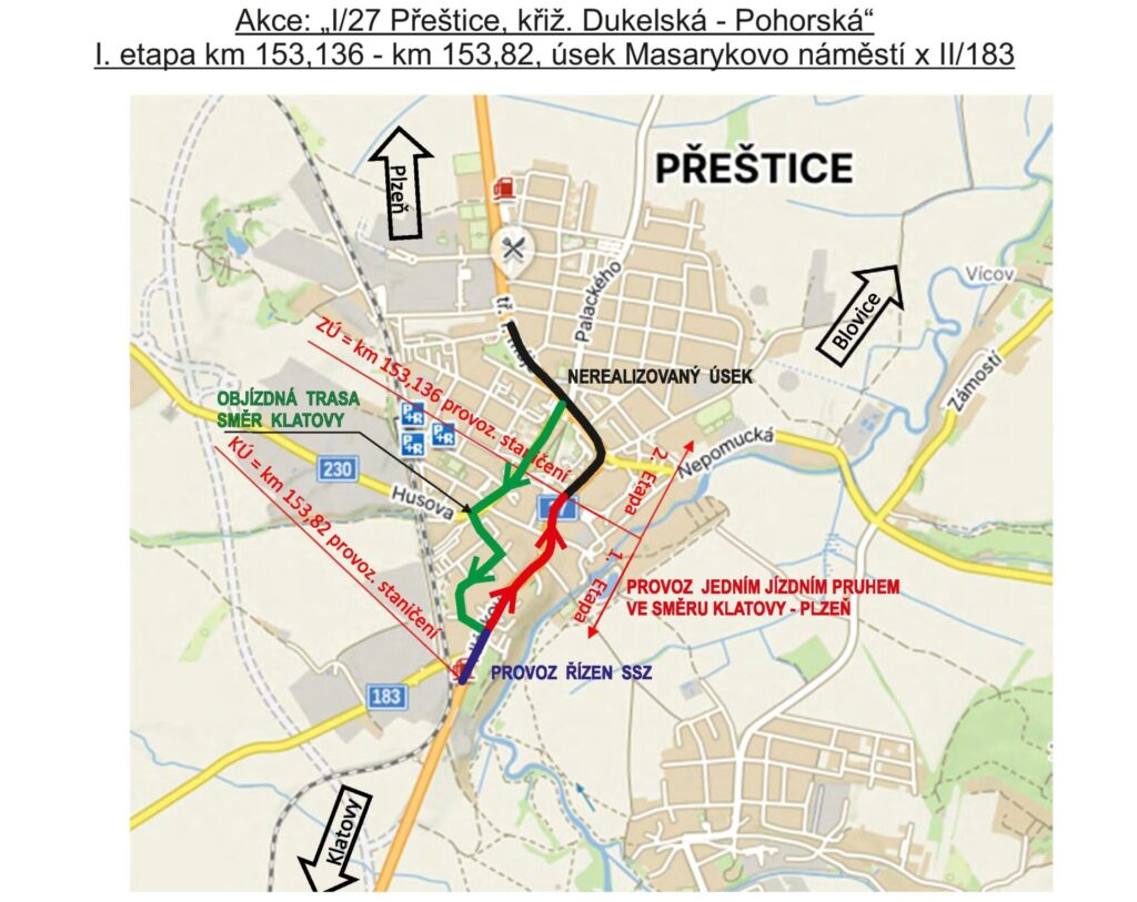 - V první a druhé etapě bude provoz po silnici I/27 veden pouze ve směru z Klatov na Plzeň jedním jízdním pruhem. Ve směru na Klatovy bude provoz veden po jednosměrné objízdné trase po silnici II/230 Husova a dále po místní komunikaci 5. května a ulici Pohorská zpět na silnici I/27.