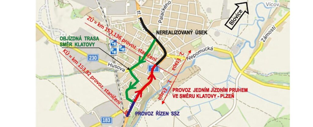 - V první a druhé etapě bude provoz po silnici I/27 veden pouze ve směru z Klatov na Plzeň jedním jízdním pruhem. Ve směru na Klatovy bude provoz veden po jednosměrné objízdné trase po silnici II/230 Husova a dále po místní komunikaci 5. května a ulici Pohorská zpět na silnici I/27.