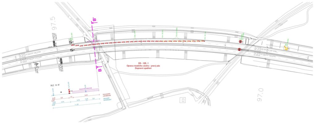 b) část levého jízdního pruhu, pravý jízdní pruh a zpevněná krajnice v km 97,150–97,460 vpravo; 29. 7. 2023–5. 8. 2023 (etapa 2, most ev. č. D5-105..1); provoz ve směru na Rozvadov bude veden 1 jízdním pruhem,