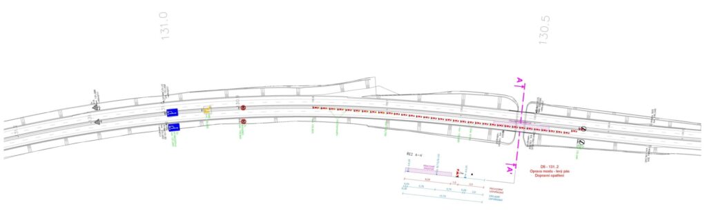 d) část levého jízdního pruhu, pravý jízdní pruh a zpevněná krajnice v km 130,800–130,440 vlevo; 6.–13. 8. 2023 (etapa 2, most ev. č. D5-131..2); provoz ve směru na Prahu bude veden 1 jízdním pruhem.
