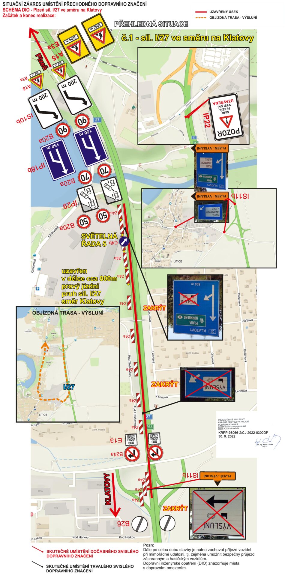 - objízdná trasa: provoz veden po levém/volném jízdním pruhu silnice I/27