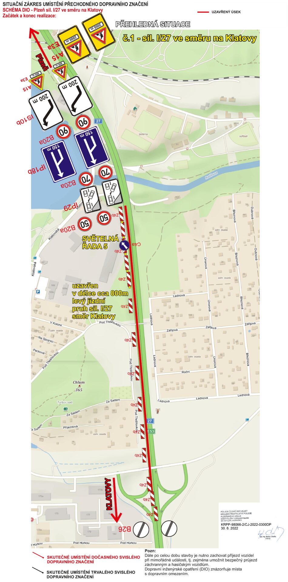 - objízdná trasa: provoz veden po pravém/volném jízdním pruhu silnice I/27