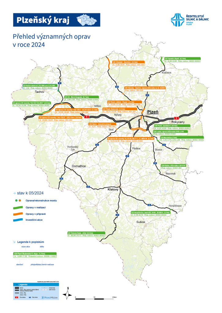Aktualizovaná mapa plánovaných a probíhajících oprav, tentokrát za květen. V současné chvíli tak probíhá už deset větších akcí. Z mapy pak vypadla například oprava silnice I/22 na příjezdu do Kdyně, která byla před několika dny dokončena.