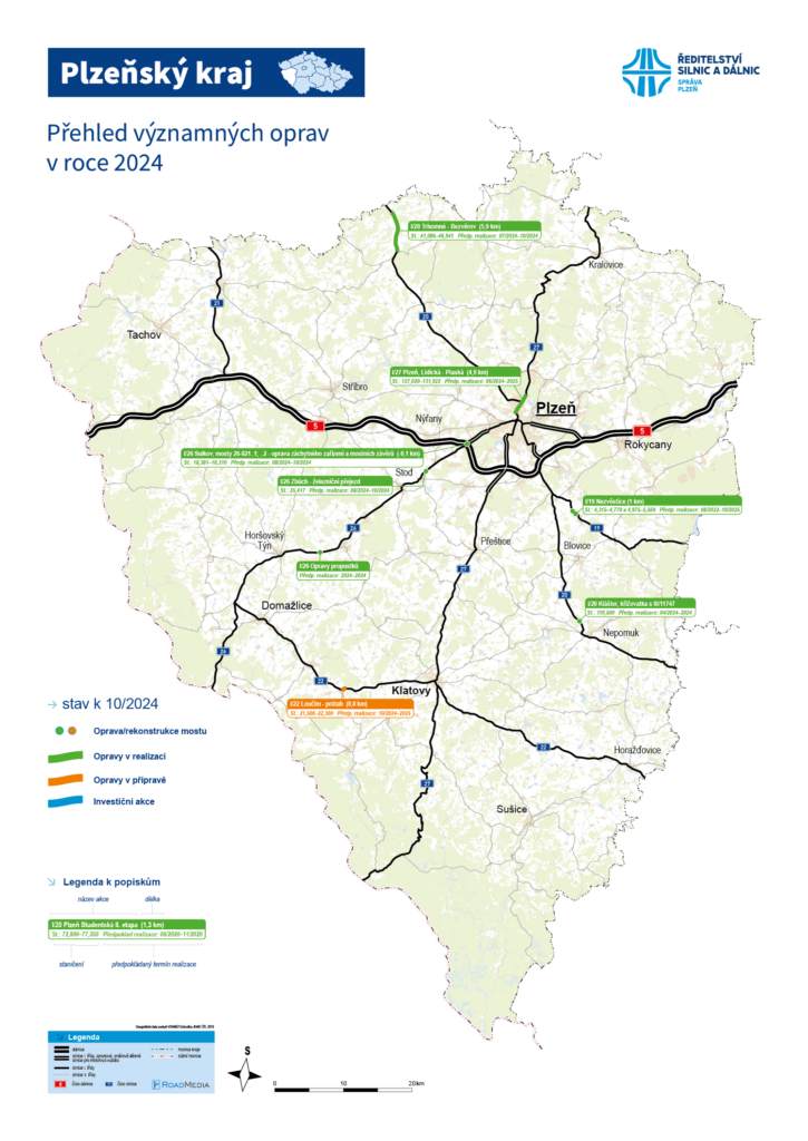 Aktualizovaná mapa plánovaných a probíhajících oprav, tentokrát za měsíc říjen. Stavební sezóna už se blíží ke konci. V podstatě hotovo je na I/20 Trhomné – Bezvěrov a I/26 Zbůch – železniční přejezd. Pouze minimální dopravní komplikace pak působí dvě další akce na I/26, a to oprava mostů v Sulkově a práce na opravách sedmi propustků mezi obcí Křenovy a Horšovským Týnem.