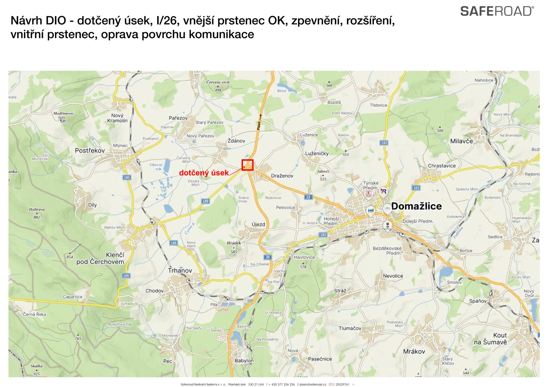 Přesněji půjde o opravu zhruba 1,3 kilometru silnice I/26 ve směru na Folmavu, 200 metrů silnice I/22 až ke značce obce Draženov a 100 metrů silnice II/189 na Klenčí (viz příloha), kde bude odfrézován původní povrch vozovky, vyrovná se příčný profil komunikace a následně budou položeny nové vrstvy vozovky – podkladní, ložní a obrusná. Po odfrézování povrchu bude provedena kontrola stavu konstrukce a případné trhliny či poškozená místa budou sanovány.