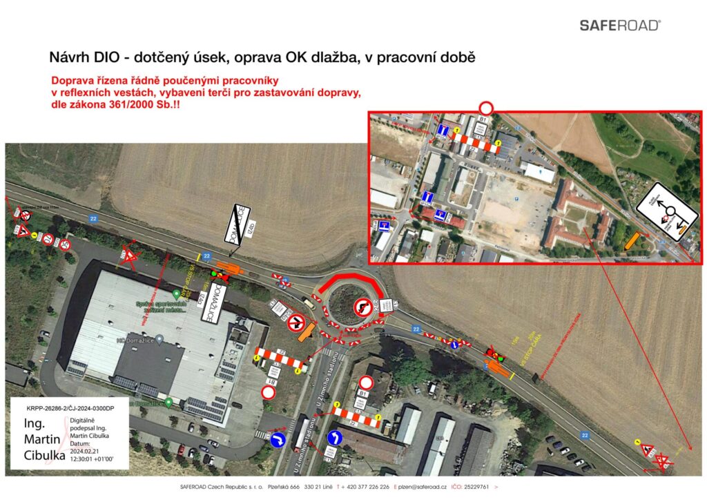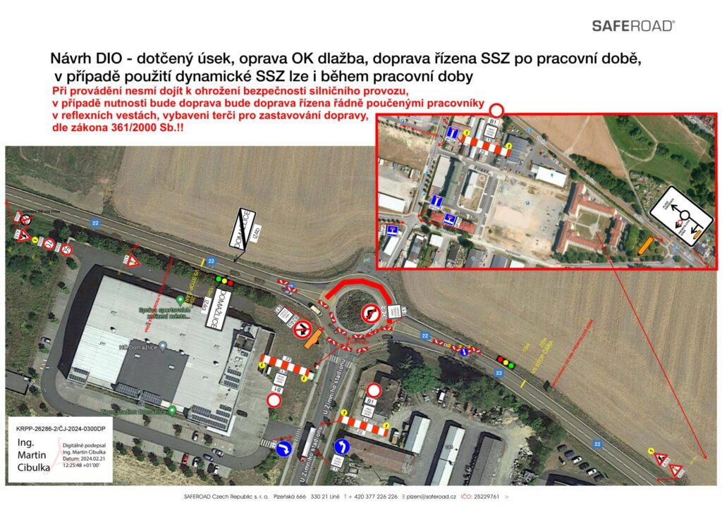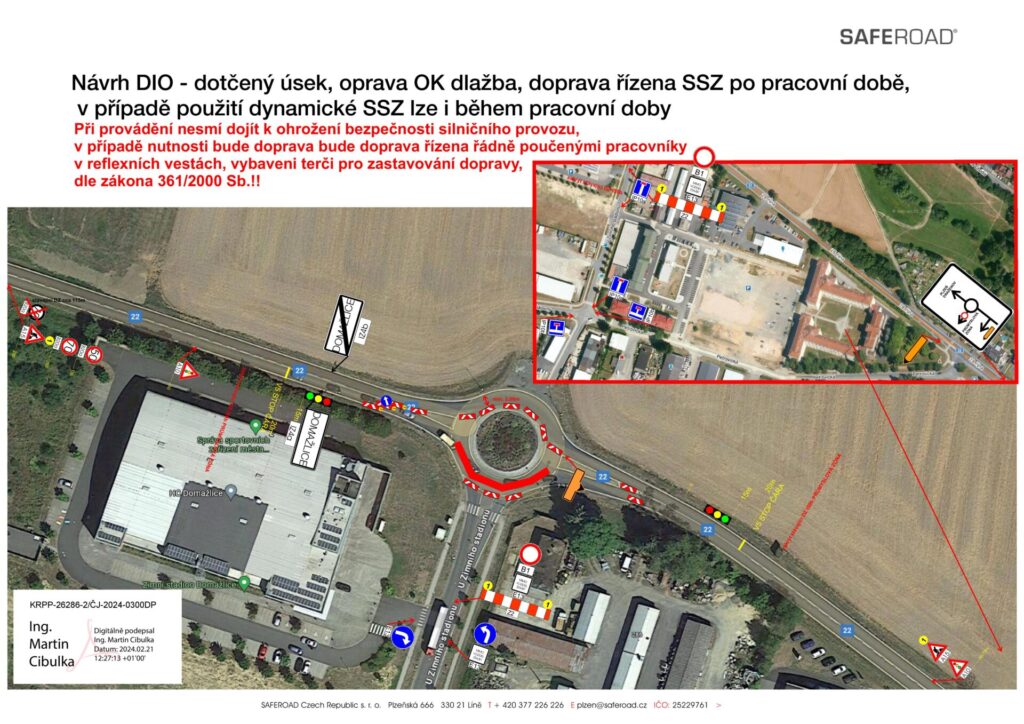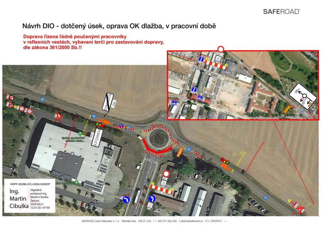 Provoz na silnici I/22 bude omezen a doprava bude vedena kyvadlově vždy po jedné polovině kruhového objezdu. Po celou dobu provádění prací nebude možné odbočit do ulice U Zimního stadionu. Příjezd do této ulice bude možný pouze přes ostatní přilehlé ulice.