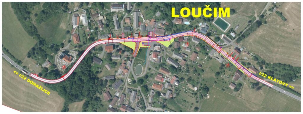 Objekt řeší opravu krytu vozovky a rekonstrukci vozovky v místě nové kanalizace a snížení nivelety pro plynulý vjezd do jižní části obce. Silnice I/22 je navržena v základní šířce 7,00 mezi obrubníky. Začátek úpravy je v km 0,000 u značky začátek obce ve směru od Domažlic. V km 0,000 a 0,090 budou opraveny stávající levostranné sjezdy ze silnice I/22, potrubí bude DN400 se šikmými čely. V km 0,081 bude provedena oprava stávajícího trubního propustku pod silnící I/22 převádějící vodu ze silničního příkopu. V km 0,295 vlevo a km 0,385 vpravo jsou umístěny autobusové zálivy, které jsou navrženy v souladu s ČSN. V km 0,344 je navržen nový přechod pro chodce. Konec úpravy je v km 0,708. Stavba v celém rozsahu respektuje stávající silnici v průtahu obce Loučim, jedná se o stavební úpravy pro zvýšení bezpečnosti a plynulosti dopravy a zajištění bezpečného pohybu chodců podél silnice I/22.