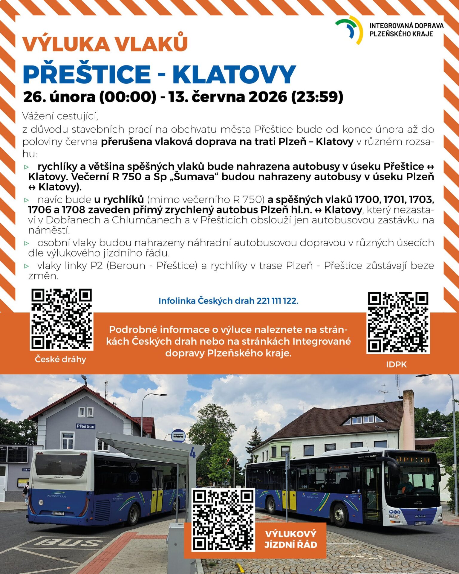 Pokračující výstavba přeštického obchvatu si od pátku 26.2. vyžádá dlouhodobou plánovanou výluku na trati Plzeň – Přeštice – Klatovy.