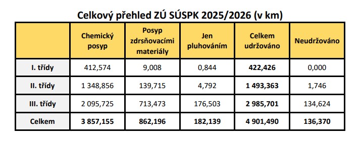 Údržbu silnic I. tříd pak pro ŘSD ČR zajišťuje sdružení společností Správa a údržba silnic Plzeňského kraje (SÚS), AVE CZ odpadové hospodářství s.r.o. a EUROVIA CZ a.s. SÚS dále zajišťuje i údržbu silnic II. a III. tříd. Silničáři jsou na následující zimní období připraveni a sklady posypových materiálů mají naplněné. Zásoby materiálu teď čítají zhruba 25 tisíc tun posypové soli a 15 tisíc tun kamenné drti. Distribuci materiálu pak pro celý kraj zajistí více než 230 kusů techniky.