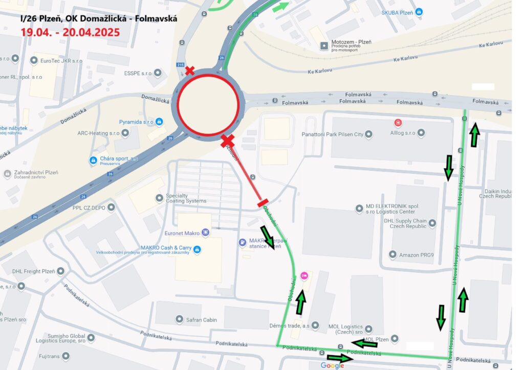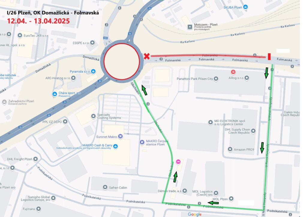 uzavřený nájezd do okružní křižovatky z ul. Folmavská, objízdná trasa vedena ul. U Nové Hospody – Podnikatelská – Obchodní