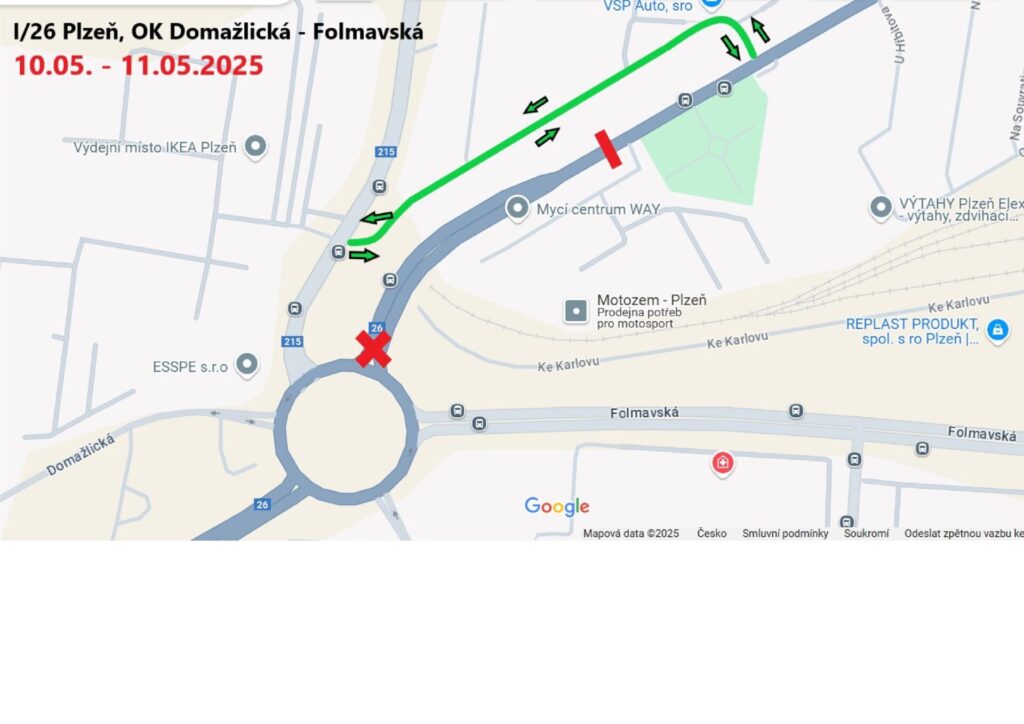 opětovné uzavřený výjezdu z okružní křižovatky do II/215 ul. Regensburská, objízdná trasa po sil. I/26 ul. Domažlická – místní komunikace podél parkoviště TIR – zpět na ul. Regensburská