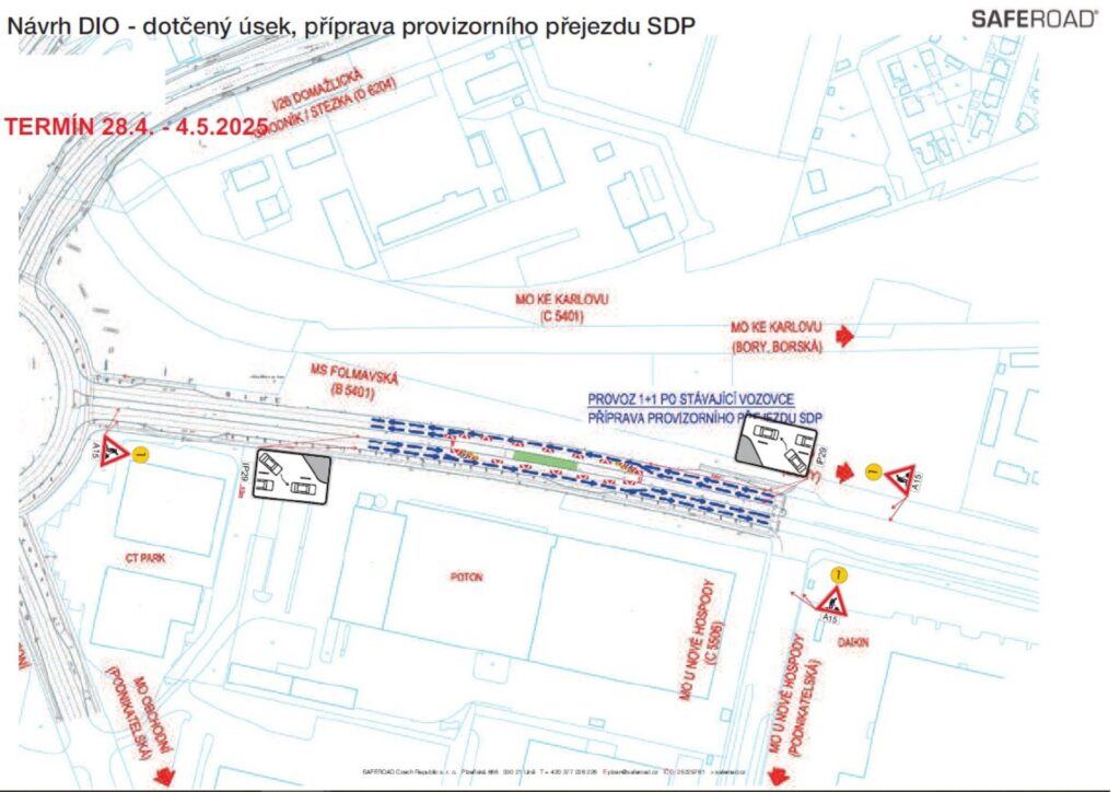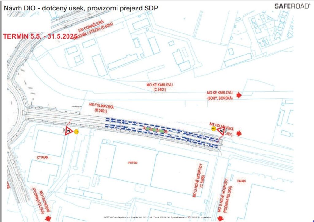 bude ul. Folmavská v části zúžena na jeden jízdní pruh v obou směrech do 04.05., dále bude v ul. Folmavské umístěno „pracovní místo“