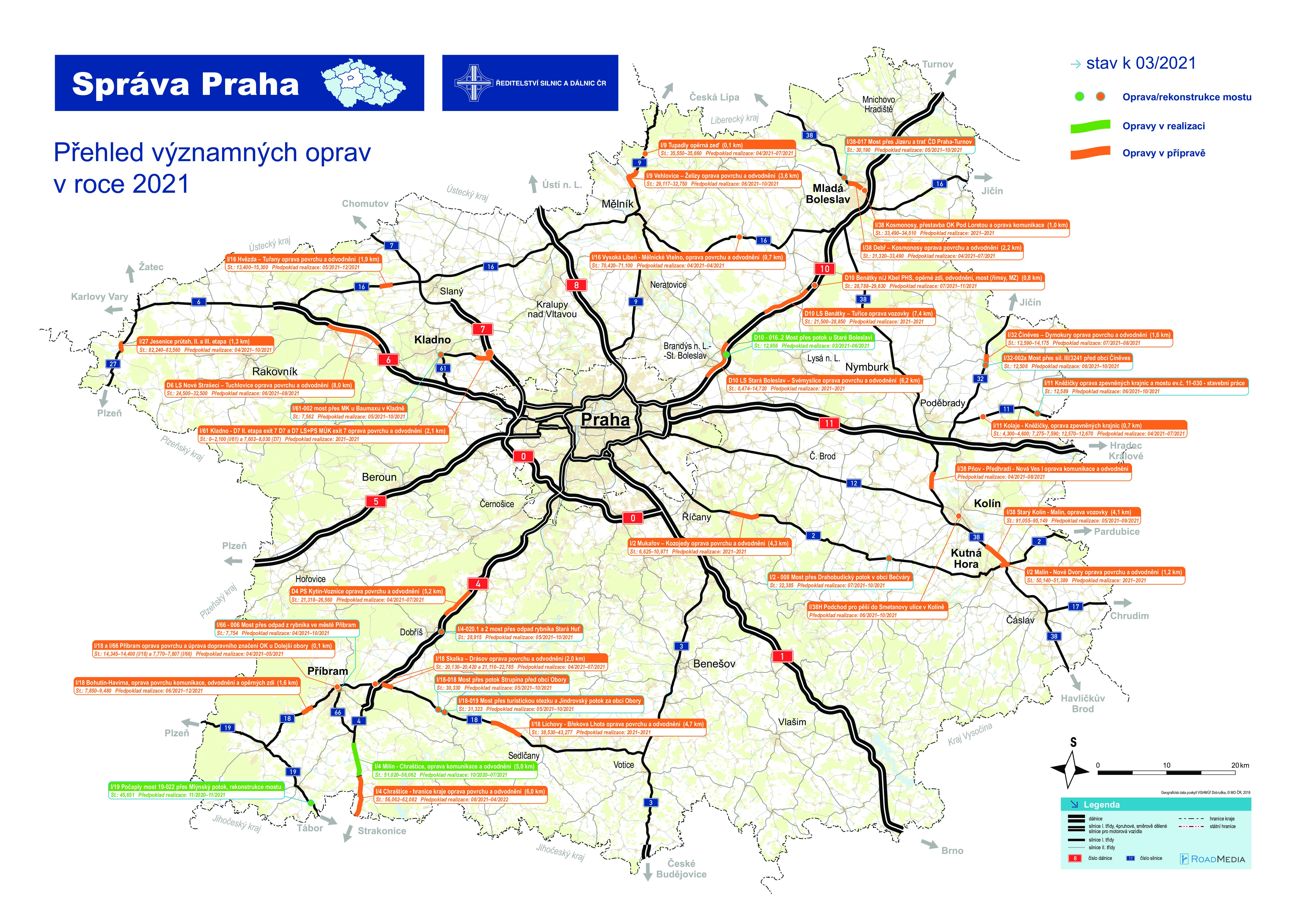 Ve Středočeském kraji již od počátku března pokračujeme v opravách započatých v loňském roce nebo zahajujeme opravy nové. V letošním roce plánujeme ve Středočeském kraji realizovat větší opravy a rekonstrukce za více než 3 miliardy Kč bez DPH. Opravit by se při nich mělo přes 70 km vozovek a v různém rozsahu více než 2 desítky mostů, přičemž uvedená čísla nezahrnují 2 modernizované úseky D1 v kraji.