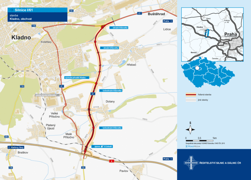 Připravujeme přeložku silnice I/61, která v délce 5,3 kilometrů odvede dopravu ze zastavěných aglomerací obcí Malé a Velké Přítočno a města Kladna. Nová silnice I/61 bude vedena nezastavěnou oblastí východně od uvedený obcí. Stavba bude začínat okružní křižovatkou na MUK 12 Unhošť dálnice D6 a zpět na stávající komunikaci I/61 se vrátí mezi Kladnem a Buštěhradem, kde bude napojena rovněž novou okružní křižovatkou. Na tuto křižovatku bude napojen také východní kladenský přivaděč v délce 1,3 kilometru, který tvoří součást projektu. U Buštěhradu bude navazovat na plánovaný obchvat této obce.