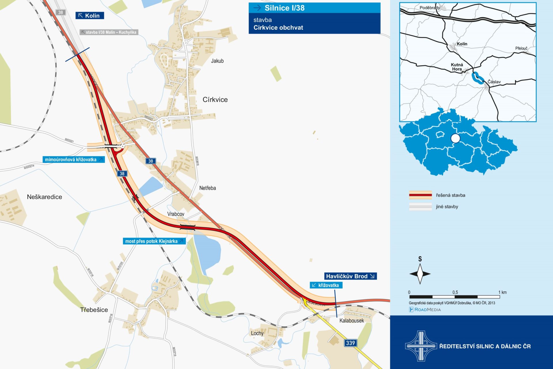 Stavba I/38 Církvice obchvat je větší částí souboru dvou staveb v rámci obchvatu obce Církvice, a to v úseku Malín–Kalabousek. Tato stavba zahrnuje výstavbu nového obchvatu od přímého úseku silnice I/38 u čerpací stanice pohonných hmot před obcí Církvice, kde technicky navazuje na další stavbu souboru, a to „I/38 Malín–Kuchyňka“. Přeložka dále pokračuje okolo obce Církvice a za obcí podél silnice I/38 s napojením na trasu stávající silnice I/38 před městem Čáslav, a to právě v prostoru osady Kalabousek, respektive napojením na obchvat Čáslavi.