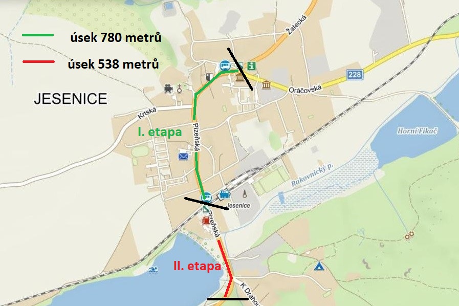 V letošním roce navážeme na I. etapu opravy komunikace silnice I/27 na průtahu městem Jesenice (okr. Rakovník), kterou jsme realizovali v období 1.4.-15.11. 2019. V rámci plánovaných 2 etap budeme opravovat povrch komunikace v ulici Plzeňská. Dále je předmětem realizace oprava propustků a vyrovnání podélného a příčného sklonu vozovky bez navýšení oproti stávajícímu stavu. V rámci 2. etapy se jedná o úsek v délce 780 metrů mezi křižovatkou I/27 x II/228 a železničním přejezdem. 3 etapa v sobě zahrnuje úsek začínající železničním přejezdem směrem ven z obce na Plzeň a končící cca 20 m za sjezdem k samotě U Velkého rybníka. Délka tohoto úseku je 538 metrů. Stavbu plánujeme zahájit nejpozději ve 2. polovině dubna a hotovo by mělo do konce listopadu tohoto roku.