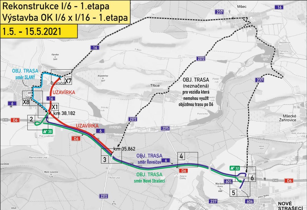 Začátkem výstavby dojde rovněž k uzavření silnice I/16 na obchvatu Řevničova a doprava mezi D6 a D7 bude obousměrně přesměrována na značenou objízdnou trasu po silnici I/6 a Řevničov ulicemi Masarykova a Husova zpět na I/16. Tato objízdná trasa je v tuto chvíli plánovaná do poloviny července 2021, kdy bude výstavba přenesena na zbývající část (větev I/6 směr Řevničov a I/16 směr D6). S postupem ve výstavbě bude souviset i změna dopravně inženýrského opatření a vedení objízdné trasy.