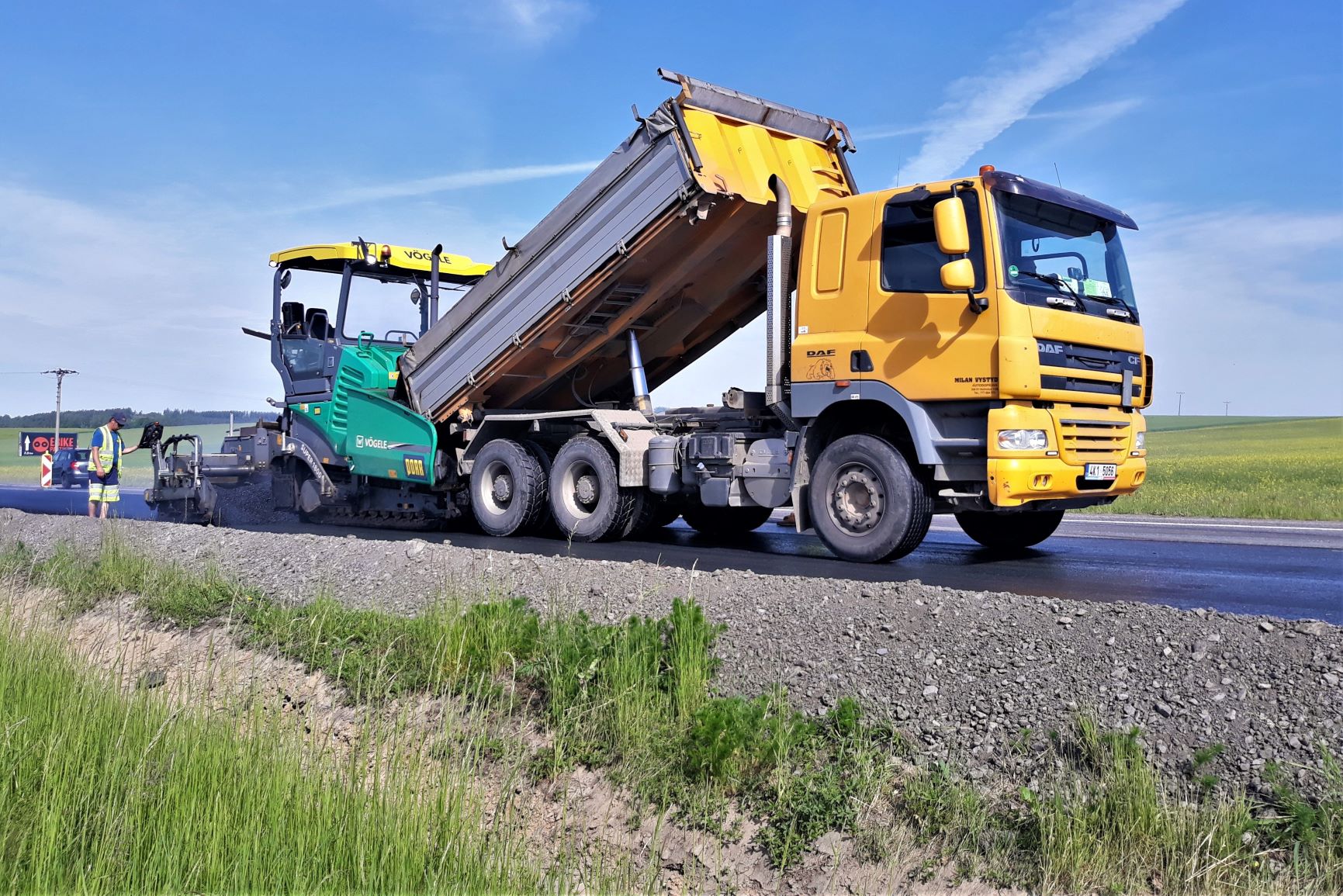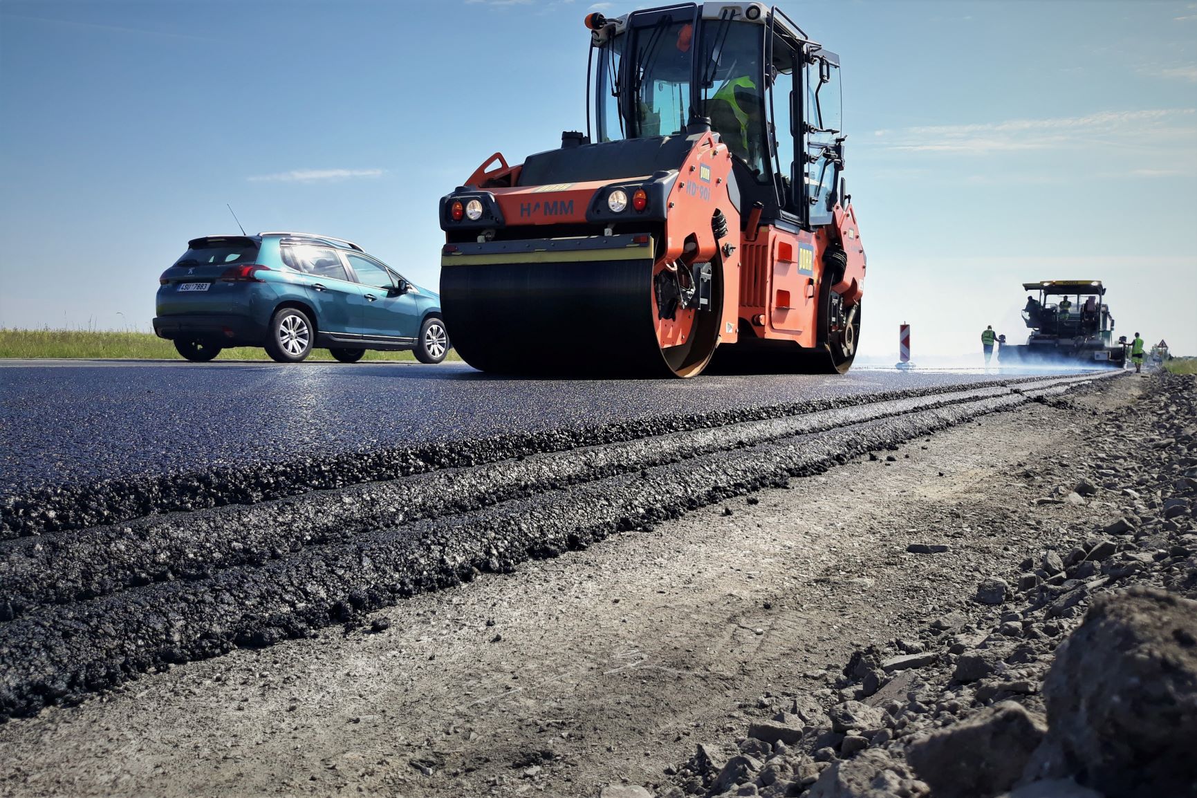 Stejné práce probíhají i v rámci IV. etapy v pravém jízdním pruhu (směr Sedlčany) před obcí Drásov. Po dokončení pokládky obrusné vrstvy, která probíhala v pátek dopoledne v rámci I. etapy, se sem přesunuly asfaltové finišery s hutnícími válci, aby i zde do konce víkendu položily 420 metrů nového asfaltového povrchu. Dnes, tj. v pondělí 7.6. se do starých konstrukčních vrstev v druhé polovině vozovky od Drásova k MÚK Skalka zakousne fréza, v úterý se odstraní staré krajnice a rozběhne se tak rovnou oprava i této poloviny vozovky. I na těchto 400 metrech u Drásova musí řidiči počítat s omezením a kyvadlově řízenou dopravou.