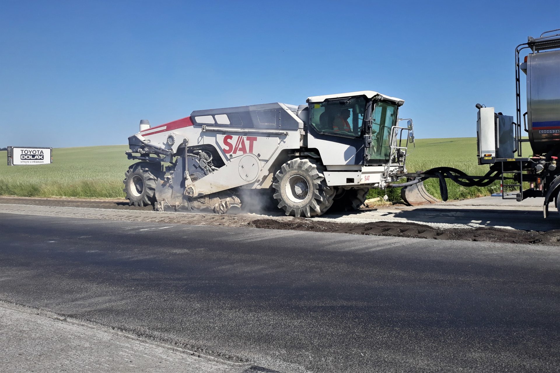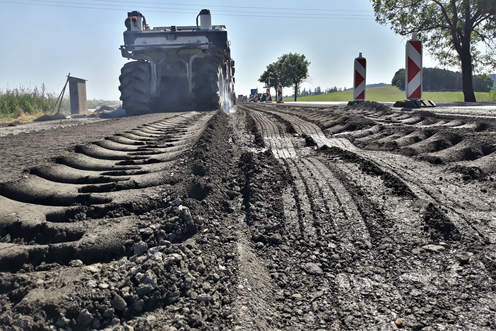 Včera v obou výše uvedených úsecích proběhla recyklace za studena. Samotná recyklace včetně nutných logistických záležitostí (dodávky cementu, vody, transport techniky atd.) je v jednom cca.400 metrů dlouhém jízdním pruhu vozovky záležitostí 5 hodin. Po předchozím vyfrézování živičných vrstev vozovky byl v tomto případě na odkrytou vrstvu aplikován v předepsaném množství cement. K recyklační fréze se připojil
