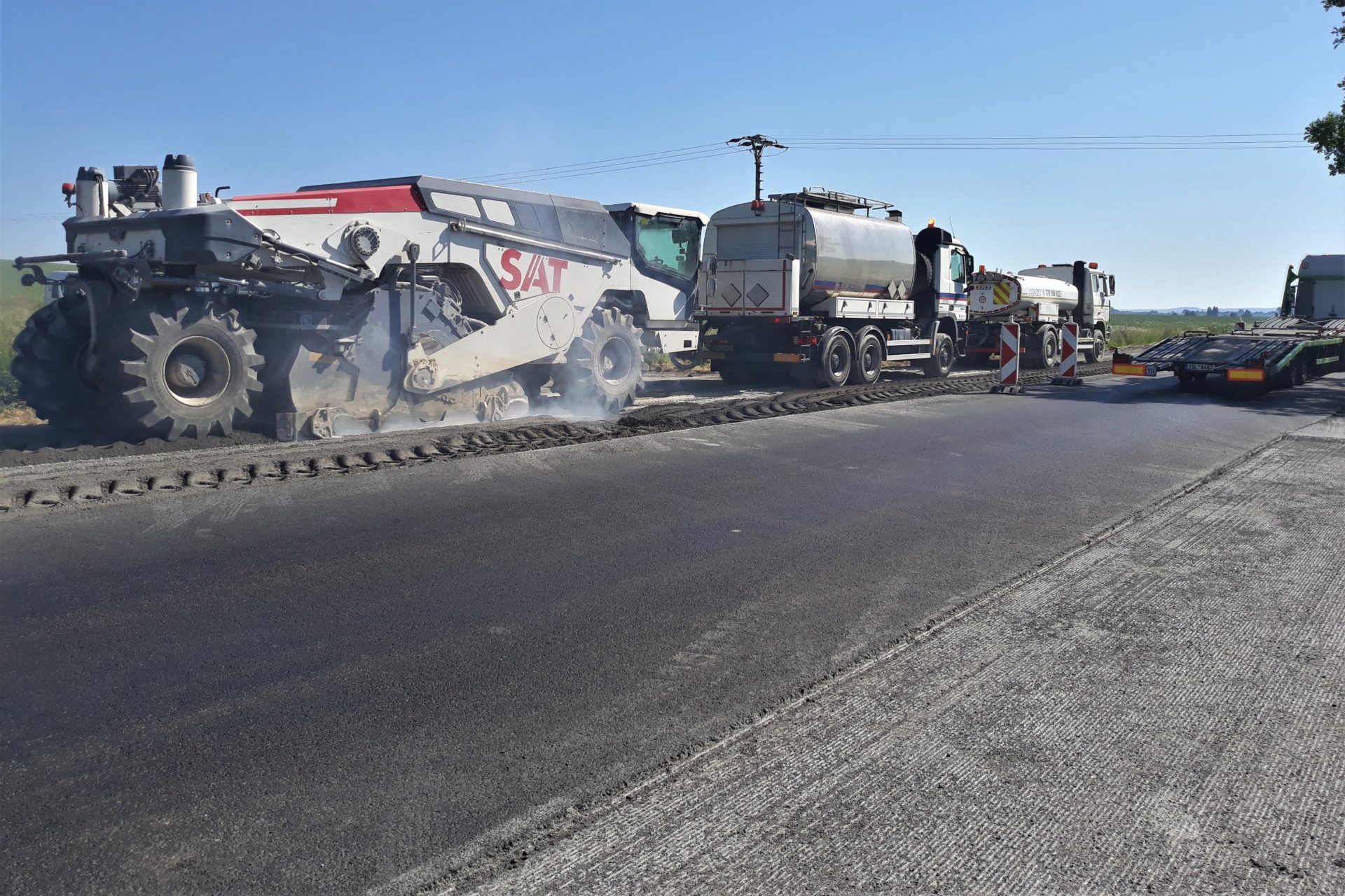 distributor vody (cisterna s vodou) a distributor asfaltového pojiva (cisterna s asfaltem). Tato pojiva (cement + asfaltová emulze) jsou při frézování staré vrstvy zapravena do této recyklované vrstvy pomocí recykléru, přičemž dávkování asfaltového pojiva a záměsové vody je řízeno počítačem v závislosti na pojezdové rychlosti stroje. V našem případě je výsledkem stmelená vrstva, která vzniká prakticky v 1 korku a zůstává za frézou. Následně je třeba vzniklou vrstvu urovnat do požadovaných geometrických parametrů grejdrem a zhutnit silničním válcem. Poté je nutné nechat recyklovanou vrstvu zatuhnout při jejím pravidelném kropení, zejména za stávajících letních teplot. Řidičům se tak může zdát, že se na opravě silnice v místě omezení nepracuje, ale technologická přestávka je nutná pro zachování kvality této vrstvy. Ta je před zahájením pokládky živičných vrstev kontrována předepsaným způsobem.