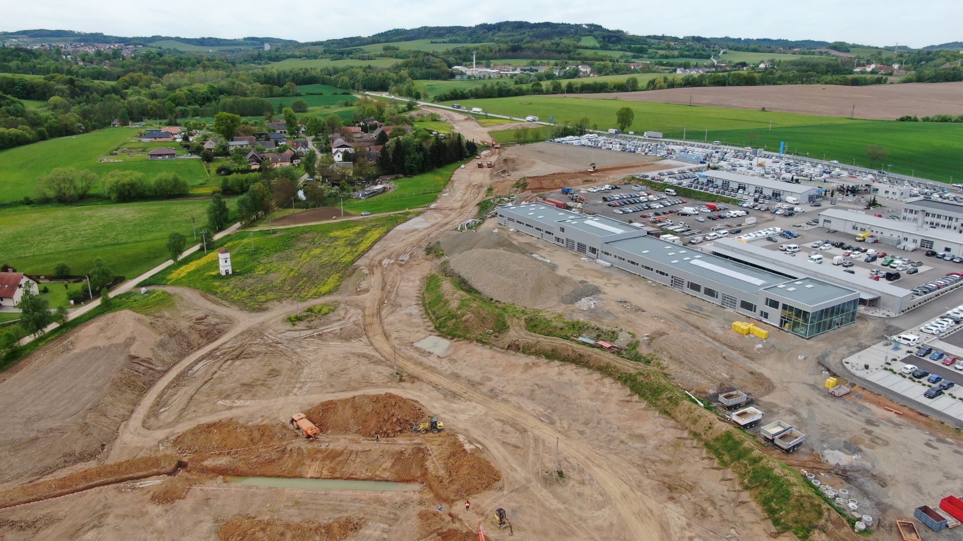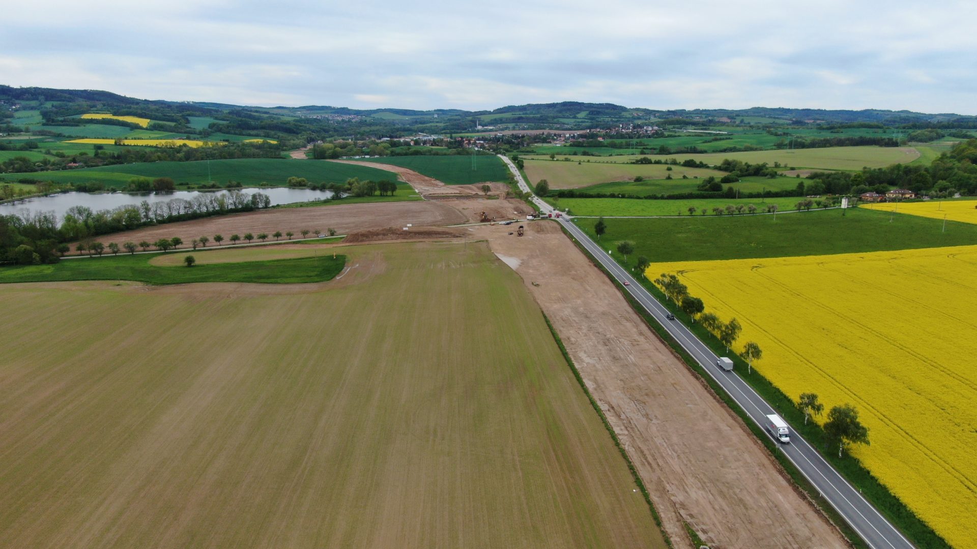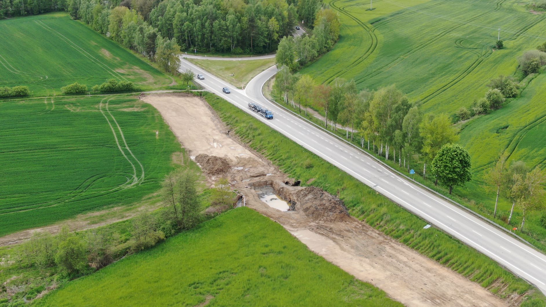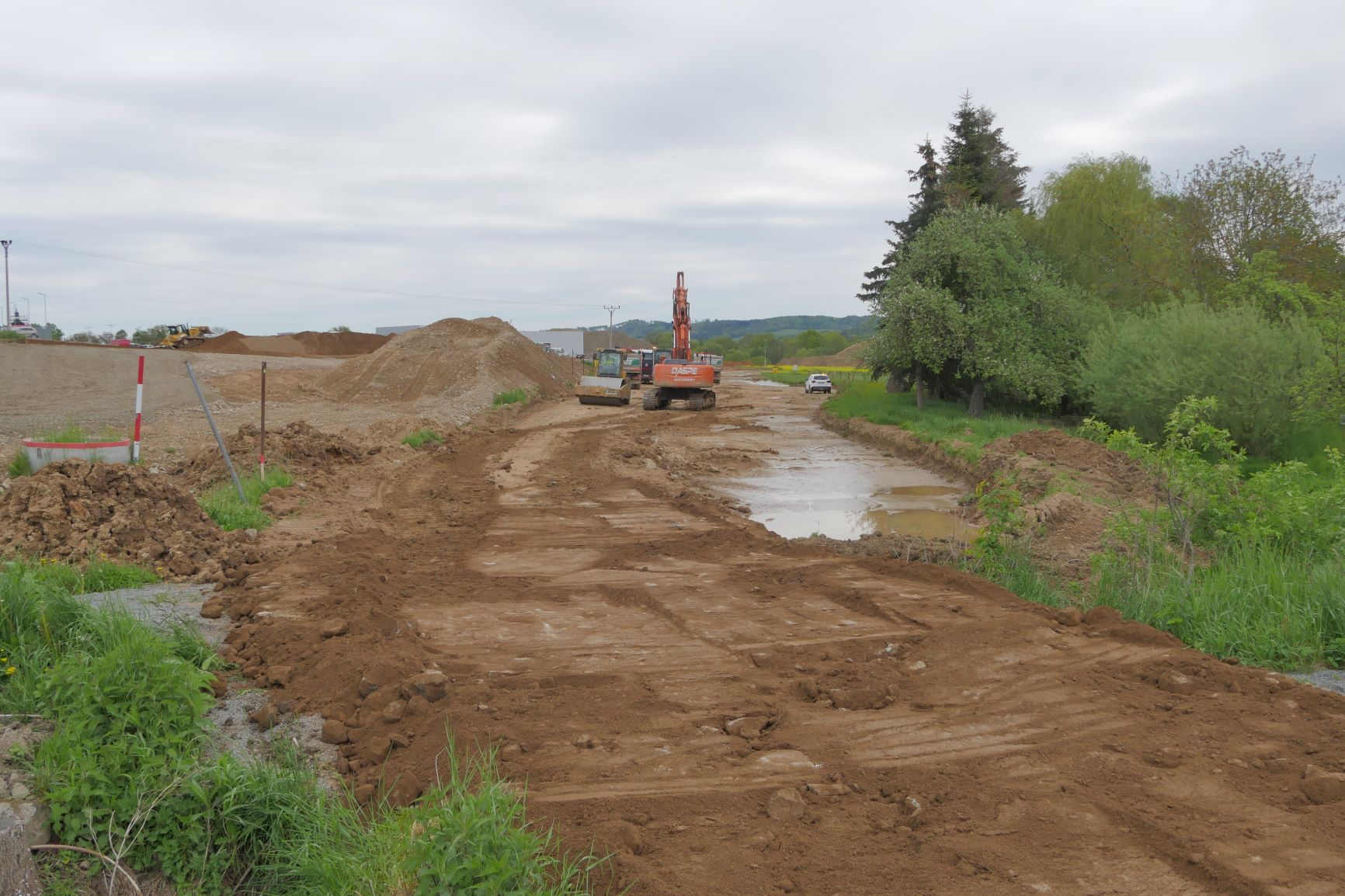 I v 2. měsíci výstavby obchvatu Olbramovic probíhají nadále především zemní práce. Na těch se promítlo zejména deštivé počasí a tak se občas výkopy proměnily v plnohodnotné jezírka či bazény. Nicméně nadále postupujeme v souladu se schváleným harmonogramem. V hlavní trase provádíme sanaci kritických míst v blízkosti vodotečí pomocí geotextílie a lomového kamene a současně probíhá zlepšování podloží pod všemi náspy pomocí hydraulického pojiva. Dále probíhají přípravné práce na úpravě vodotečí a přeložce všech vodovodů. Zahájili jsme rovněž odtěžování zářezu na začátku obchvatu směrem od Benešova. Vytěžený materiál je stavbou přemísťován do prvních vrstev budoucího náspu. Zahájili jsme již také práce na výstavbě 2 mostů. Na mostě na silnici III/00336 probíhá vrtání pilot a práce na jeho založení. Přípravné práce pro vrtání pilot jsou v běhu u mostu přes Konopišťský potok. Výkopové práce proběhly i u rámových mostů. Zde bude provedena sanace základové spáry a následně založení.