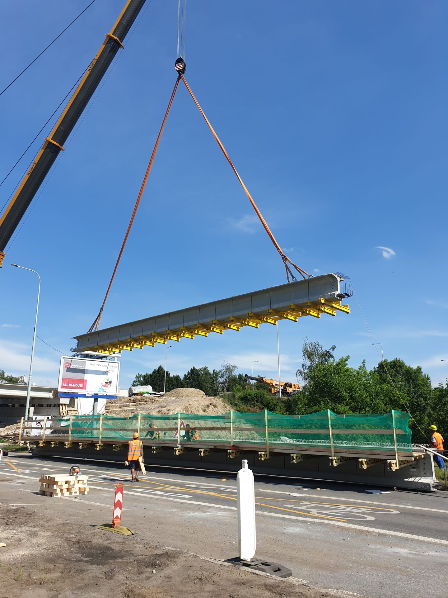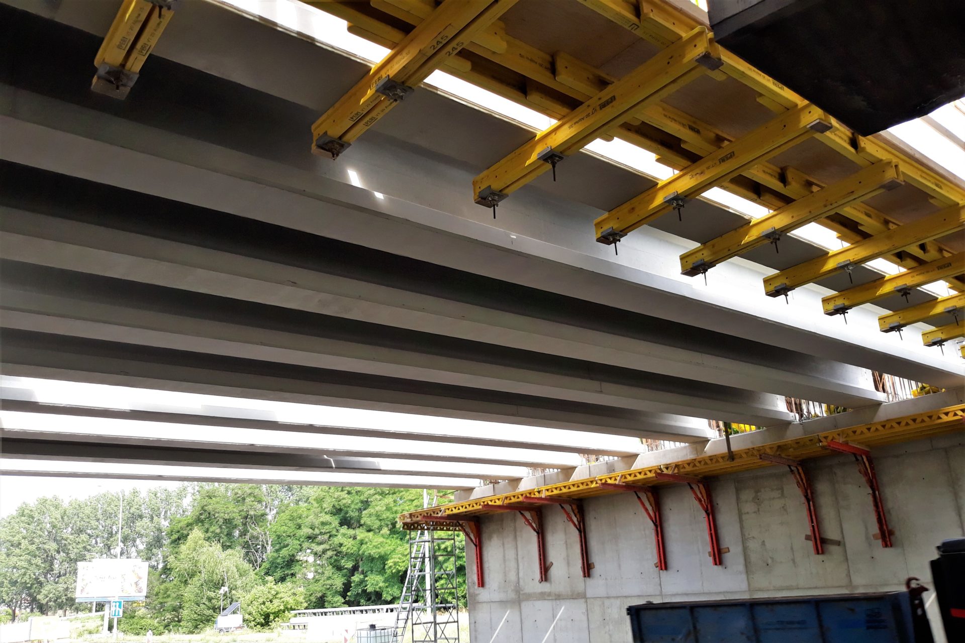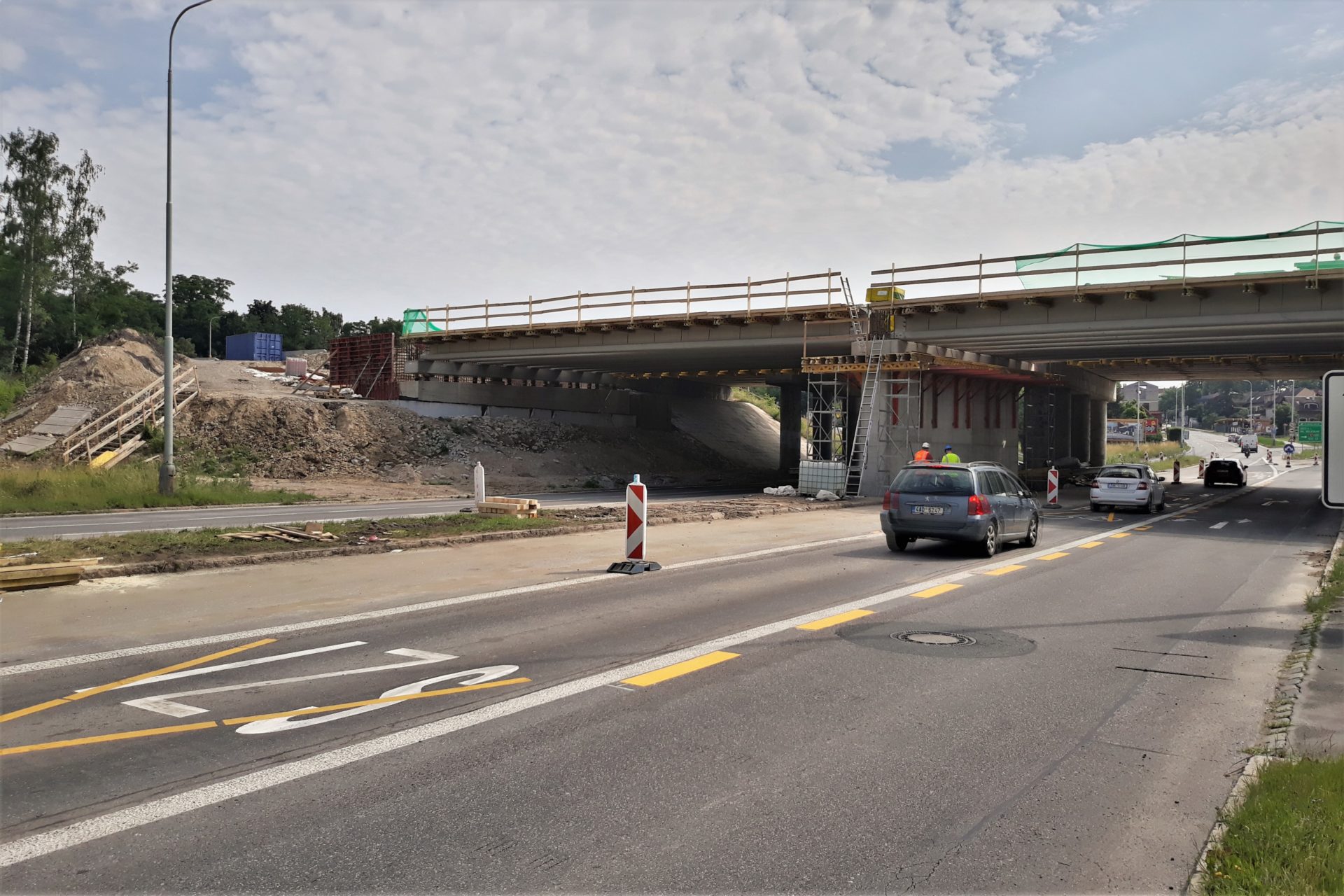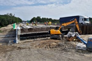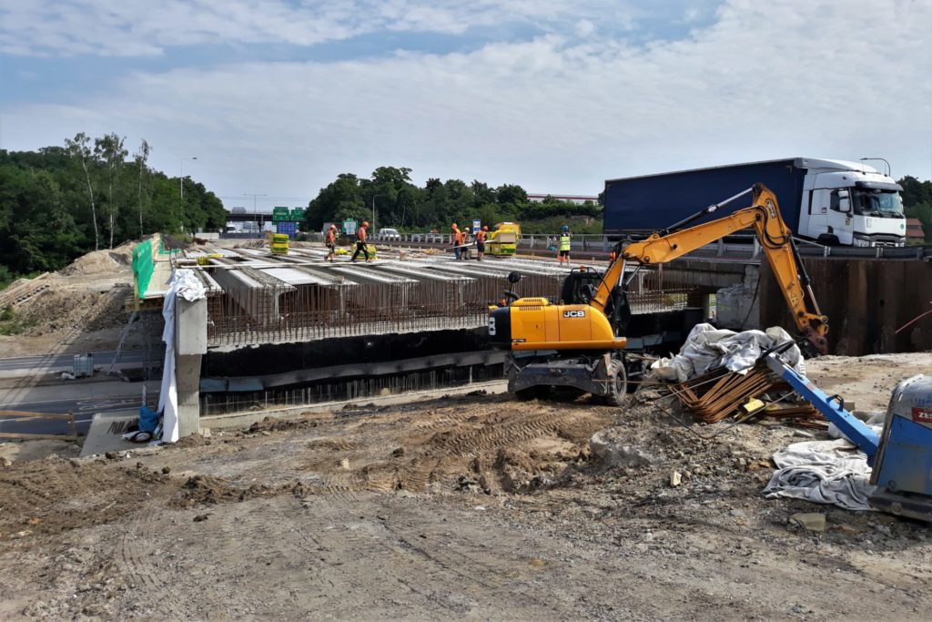 Rekonstrukce mostu na dálnici D0 přes Chlumeckou ulici v Praze probíhá podle předpokladů. Západní část mostu jsme zbourali začátkem května a o víkendu 26.-27.6. 2021 jsme již na nové opěry a pilíře osadili 18 kusů prefabrikovaných nosníků. Nyní budeme pokračovat na dokončení dolní stavby a v další výstavbě hlavní nosné konstrukce této části mostu. V nadcházejícím období přijde na řadu armování a betonáž spřažené desky nosné konstrukce. Po jejím vybetonování ji o několik milimetrů sneseme a položíme na již osazená ložiska. Provedeme zásyp pilíře P2 a zasyp za opěrami mostu a vybetonujeme křídla a závěrné zdi.