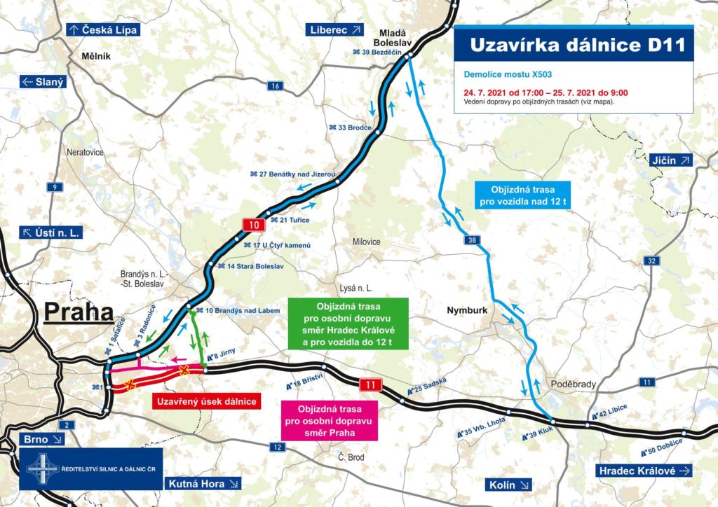 úplnou uzavírku dálnice D11 mezi km 0-8, a to od soboty 24.07.2021 17:00 do neděle 25.07.2021 09:00,