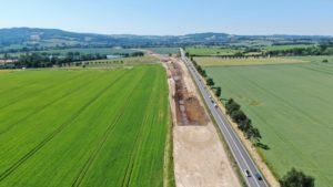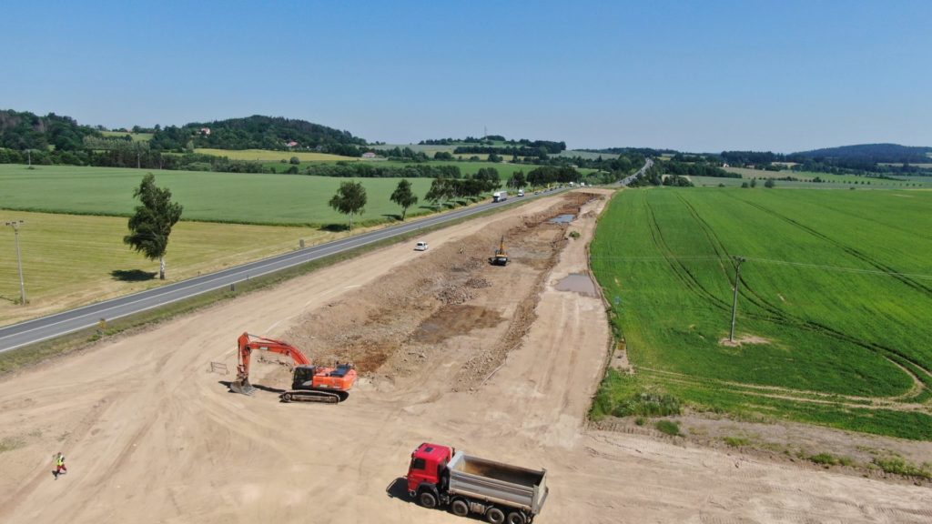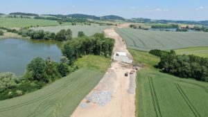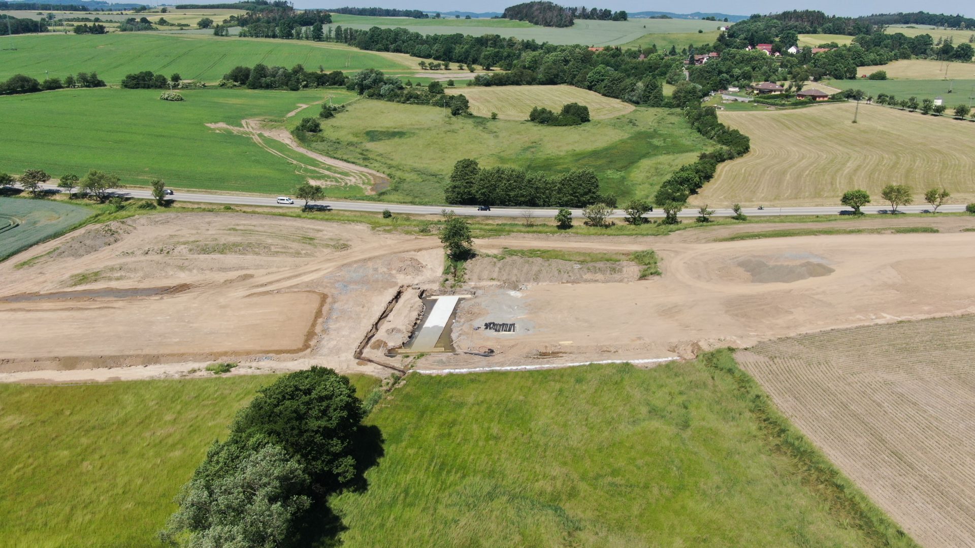 Archeologové ukončili práce v hlavní trase budoucího obchvatu Olbramovic na silnici I/3 a uvolnili tak zkoumanou lokalitu u kapličky stavební technice. Ve směru od Benešova i nadále probíhá odtěžení zářezu. V celém úseku v km 0,0 – 0,8 bude materiál odtěžen do úrovně pláně. V tomto místě bude řešena výměna aktivní zóny, vhledem k podzemní vodě, která se vyskytuje lokálně v místě těžby. Vytěžený materiál bude ukládán do násypu v km 0,8 – 0,95 a v km 1,0 – 1,2. V místě zářezu bude rovněž řešeno a zajištěno odvodnění těchto míst. Po zasanování kritických částí v km 1,8 a 2,1 hlavní trasy (SO 101.1) již provedeme první vrstvy násypu. Plánujeme také zahájit těžbu druhého zářezu v km 1,2 – 1,8, kde bude třeba vytěžit zhruba 55 000 m3 zeminy. Probíhá svahování násypů podle 3D modelu a dostatečné odvodnění po celé stavbě. Výkopové práce a sanace podloží probíhají v místě rámové vpusti, aby následně proběhlo betonování podkladních vrstev a osazení prefa rámu.