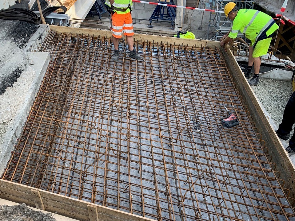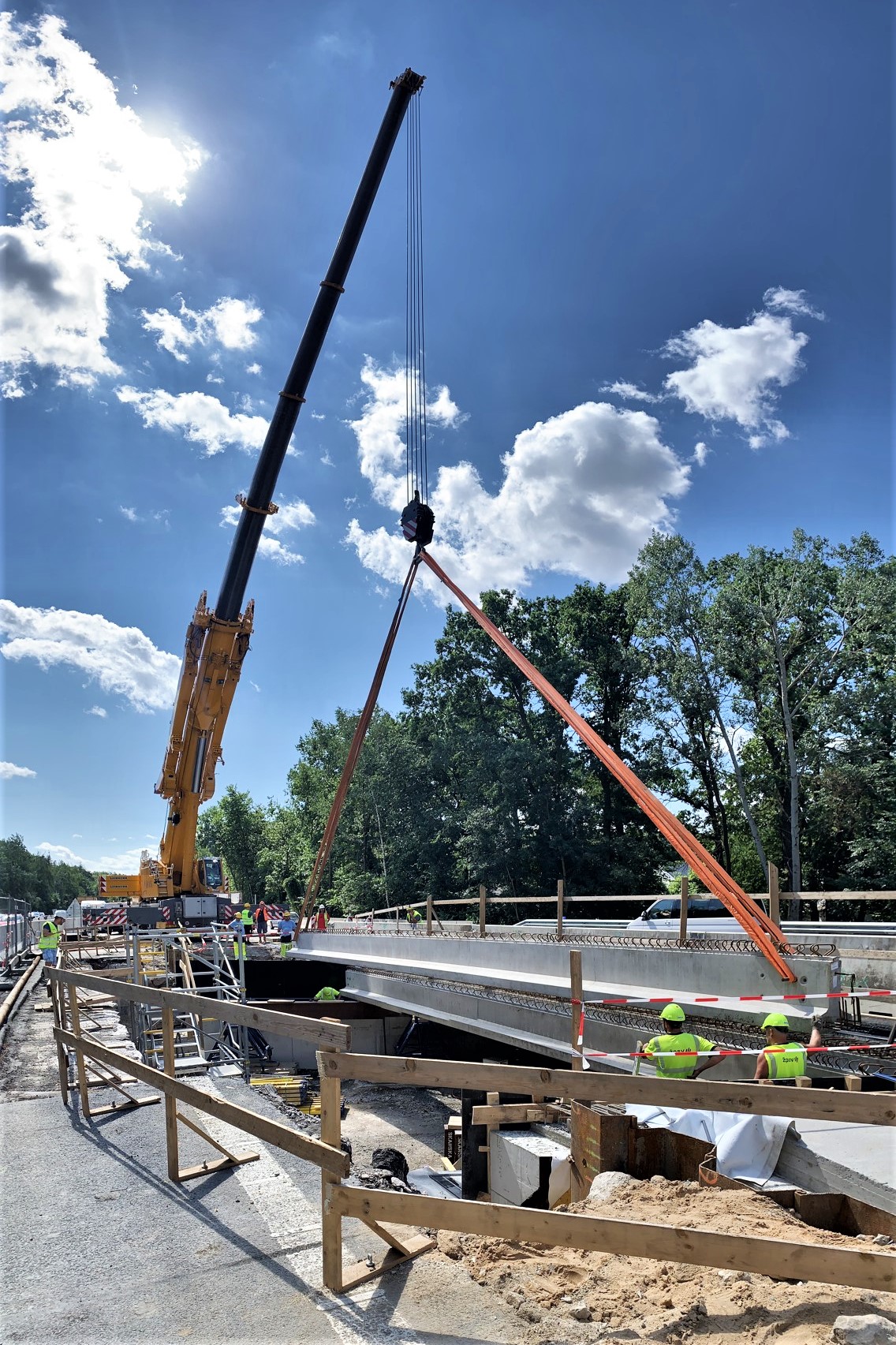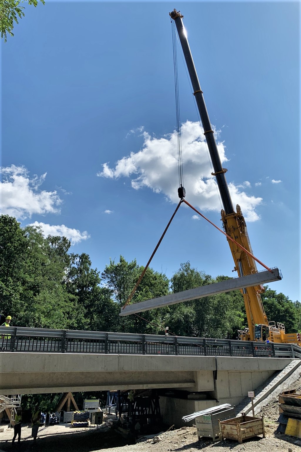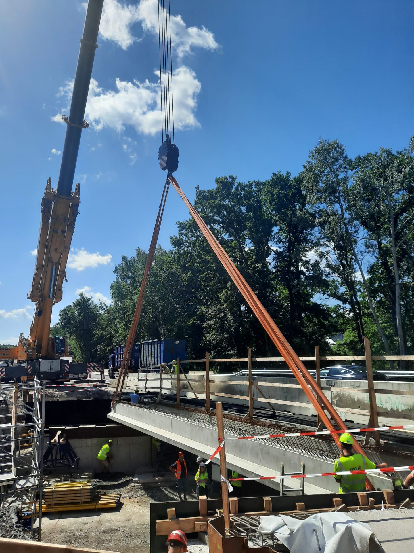 Na dálnici D10 pokračujeme v opravě dálničního mostu ev.č. D10-016 u Staré Boleslavi, kde momentálně pracujeme na jeho levé části v levém jízdním pásu ve směru na Prahu. Ve středu jsme na podložiskové bloky vybetonované na opěrách uložili samotná ložiska a provedli jsme betonáž přechodové desky. Včera jsme uložili ve středové části předem předpjaté prefabrikované nosníky. Celkem je nosná konstrukce části mostu ve směru na Prahu tvořena 12 kusy.